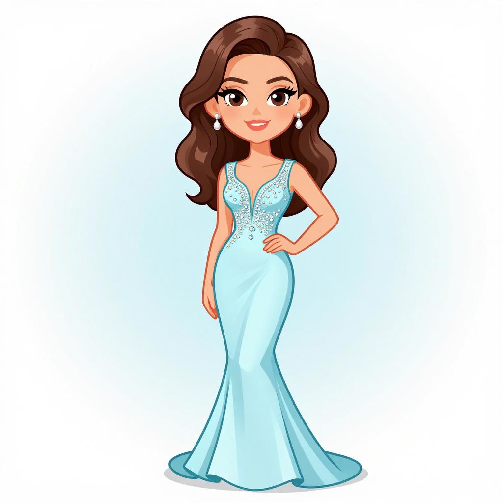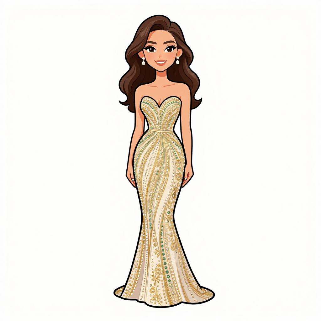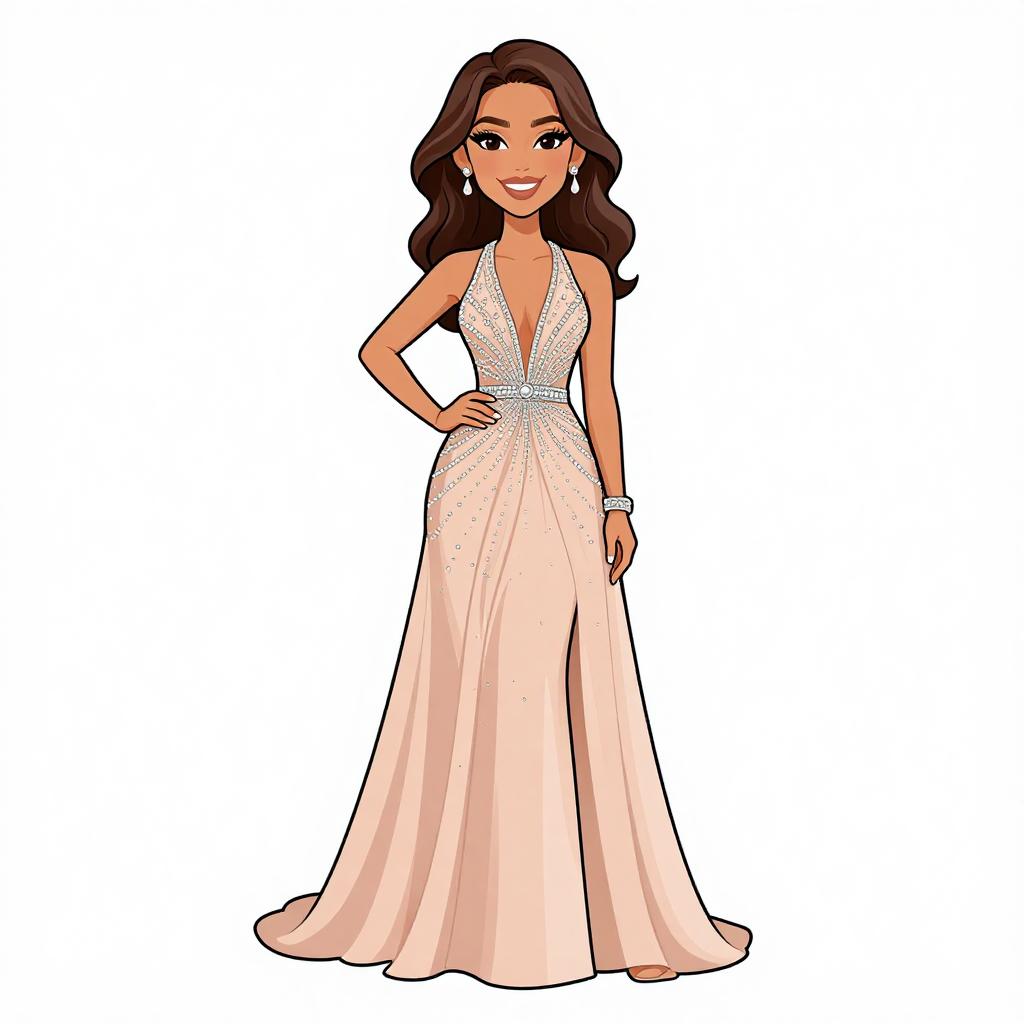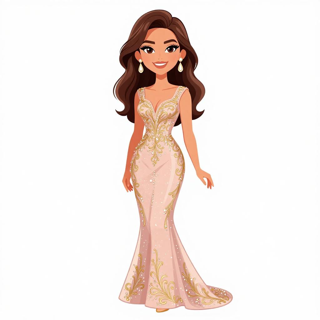 Woman with pretty face and pretty hair. smiling Woman, evening glamour, form-fitting evening gown in blush pink, intricate gold embroidery and beadwork on bodice and throughout the dress, V-neckline, sleeveless, floor-length with a mermaid tail silhouette, embroidered sheer overlay, large teardrop earrings, white background. --sref 1467