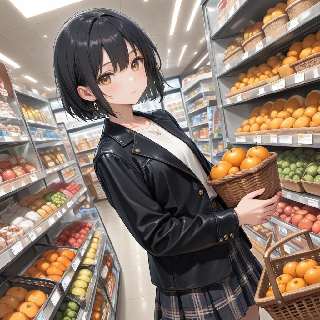 Anime-style illustration of a young girl with short black hair and yellow eyes shopping indoors in a grocery store. She is wearing a black leather jacket, white shirt, and plaid skirt, holding a basket filled with oranges and a wicker basket containing more oranges. The scene shows a variety of fruits neatly arranged on supermarket shelves with a Dutch angle perspective.