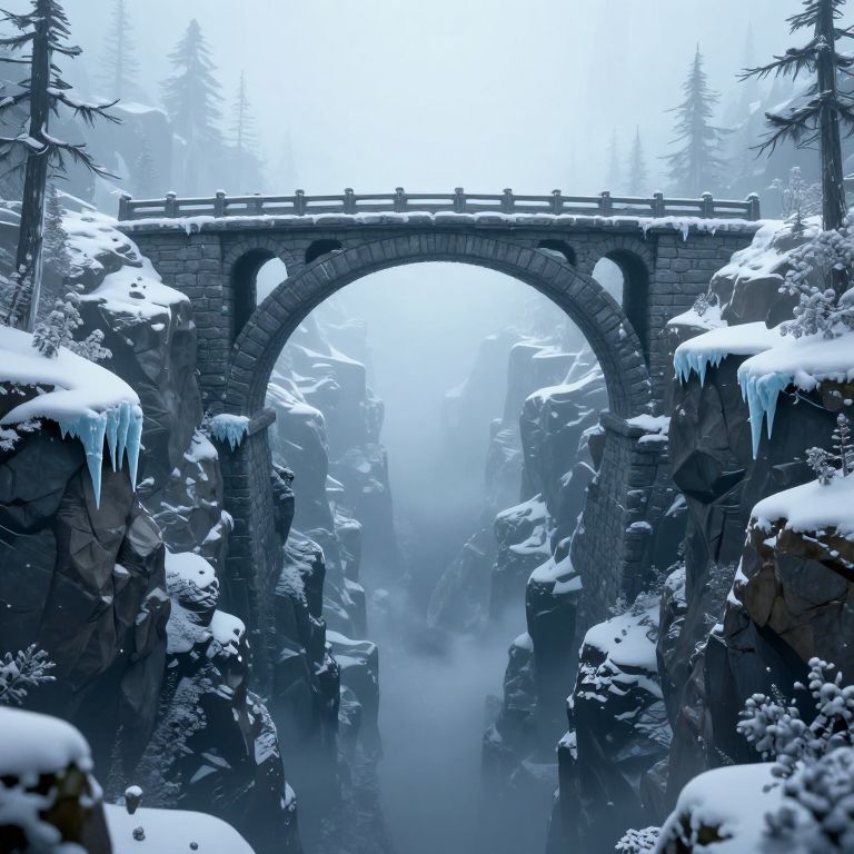 Snow-covered stone arch bridge with icicles, spanning a misty, rocky canyon surrounded by snow-laden evergreen trees, in a winter landscape.