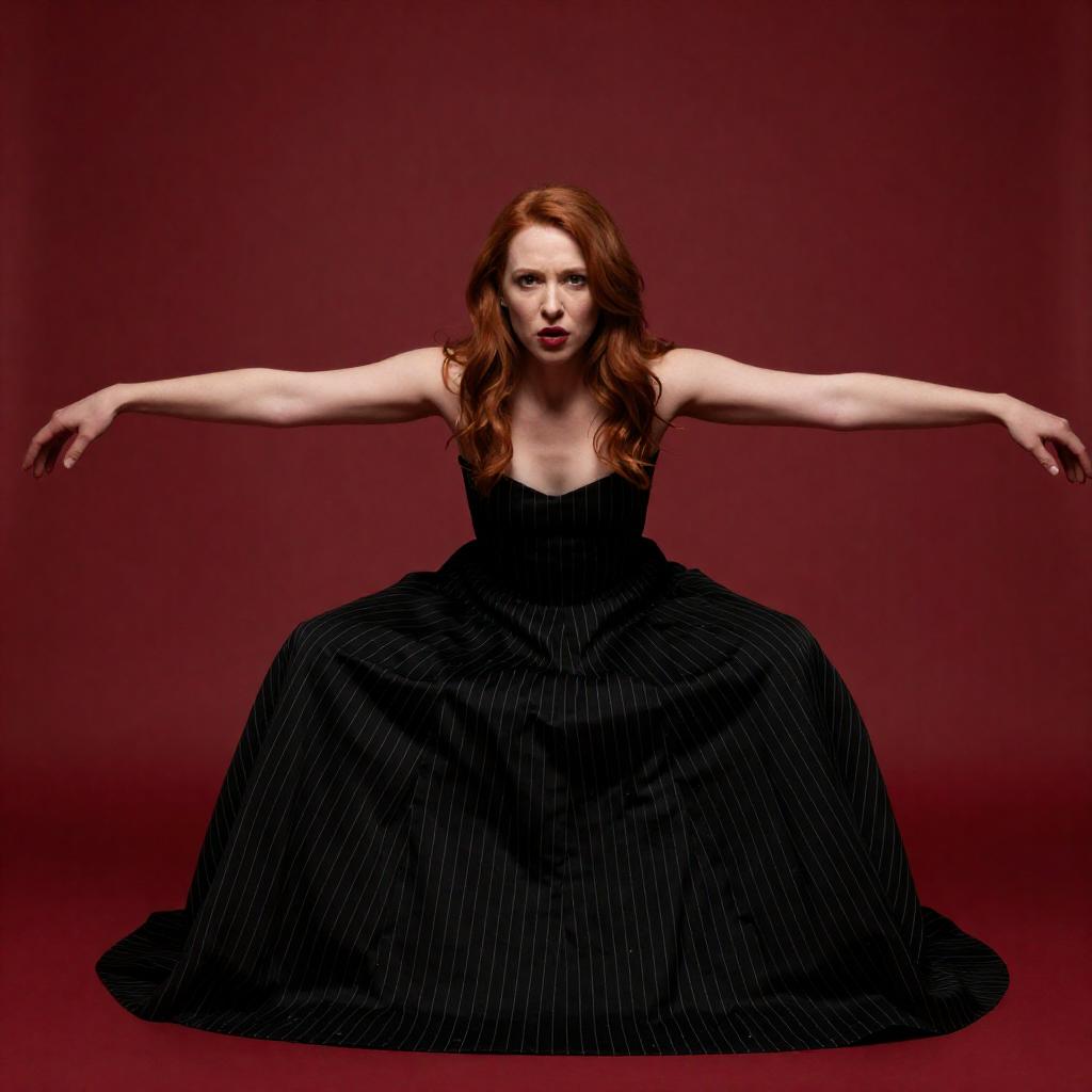 Photograph of a woman with long, wavy red hair, arms outstretched, mouth open in an intense yell. She wears a black tank top, has tattoos on her upper arms, and stands in front of beige curtains in a dimly lit room. Her facial expression is fierce and determined.