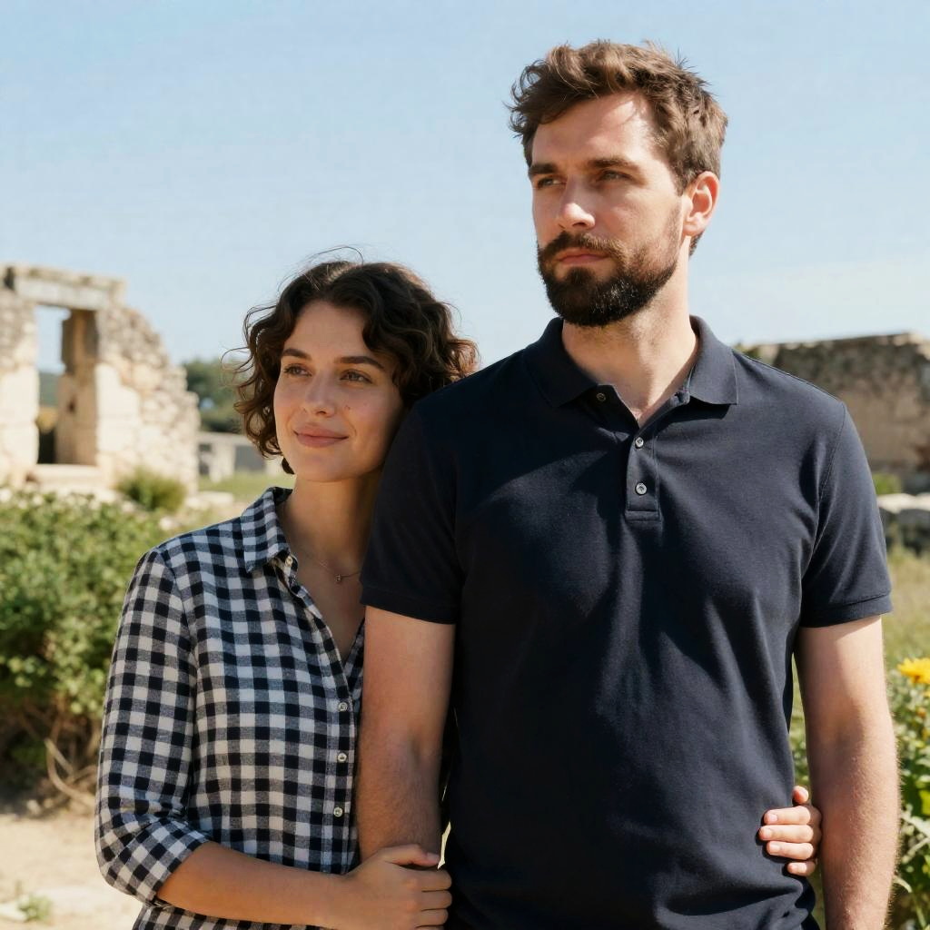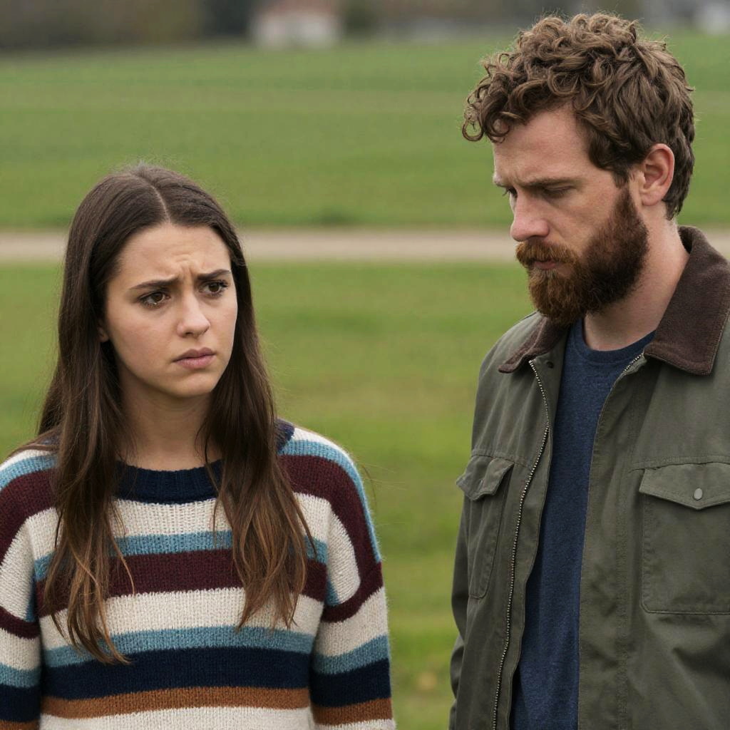 Photograph of two people on a boat. Bearded man with curly hair, serious expression, wearing tan vest over blue shirt. Woman with curly hair, surprised expression, wearing blue shirt, tan vest. Clear sky, boat canopy overhead. Both facing camera.
