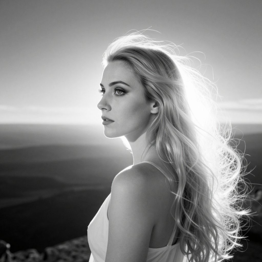 Black-and-white photograph of a blonde woman with glowing hair, profile view, wearing a white top, against a bright sky and dark landscape.