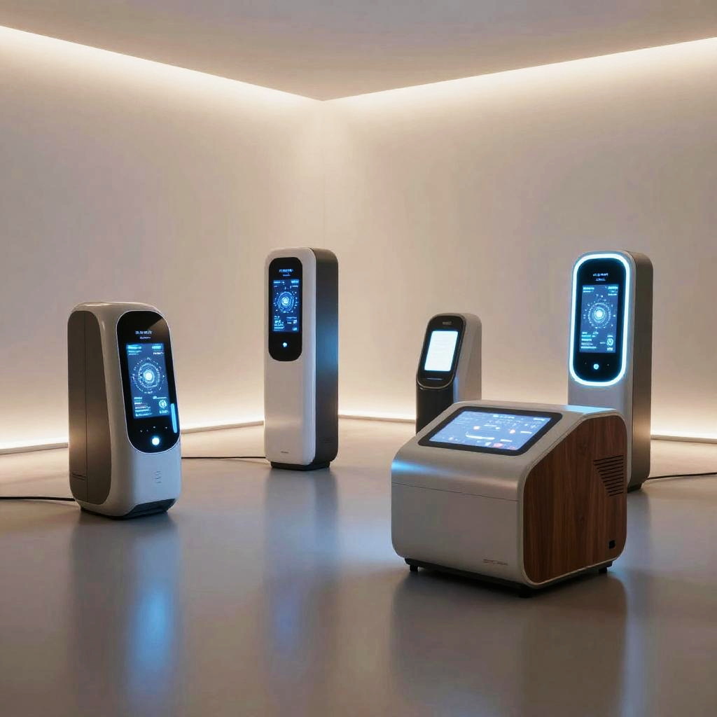 Furniture AI concept, sleek modern smart furniture pieces integrated with glowing digital panels, minimalist room setting with futuristic ambient lighting, high-tech craftsmanship in wood and metal, serene and innovative atmosphere