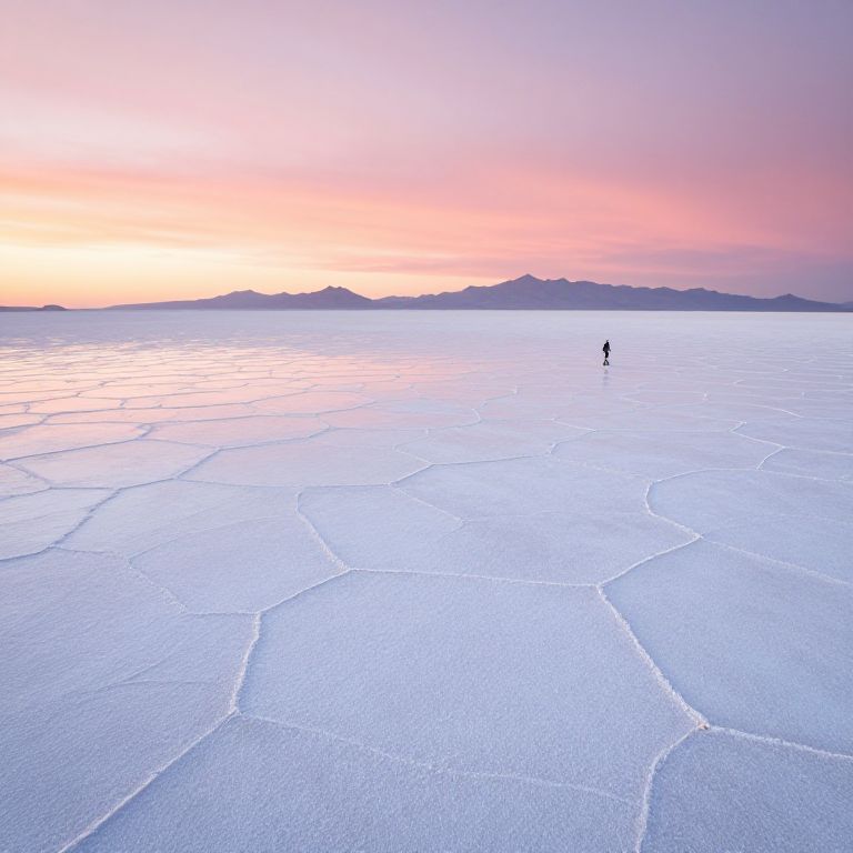 Photograph of a vast, salt flats landscape at sunset. The ground is covered in a crystalline, white, hexagonal salt texture, reflecting the pink, orange, and purple hues of the sky. A small, solitary figure stands near the center, appearing tiny against the expansive salt flats. Distant mountain silhouettes are visible on the horizon, adding depth to the scene. The sky transitions from bright yellow near the horizon to soft pink and purple shades higher up, creating a serene and otherworldly atmosphere.