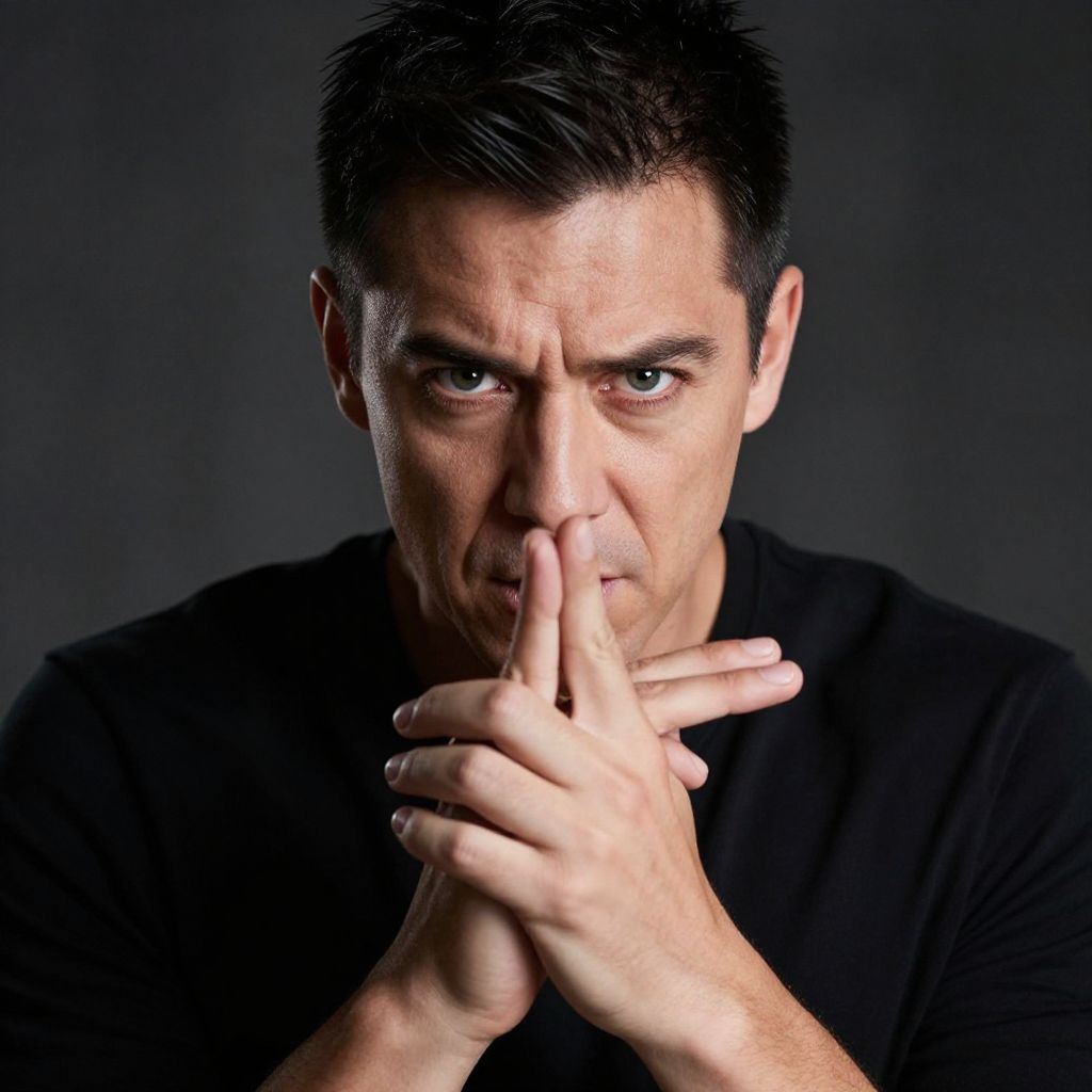 [[man,persuasion images]]Powerful portrait of a charismatic individual, using captivating body language, dramatic facial expressions, and persuasive hand gestures to convey confidence, authority, or passion. Dynamic composition, off-center framing, shallow depth of field, blurred background, high contrast lighting, moody ambiance, evoking an emotional connection with the viewer. Man has masculine face and piercing eyes