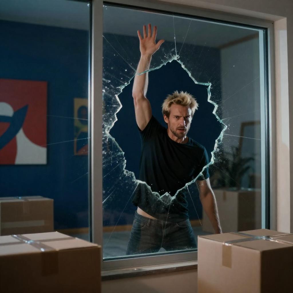 Photograph of a man with short blond hair, wearing a black shirt, breaking through a large glass window with his right arm raised. Splintered glass surrounds him. Dark blue background with red and white abstract paintings on the left. Multiple cardboard boxes on the floor. Intense expression on his face. Blue and white light from outside illuminates the scene.