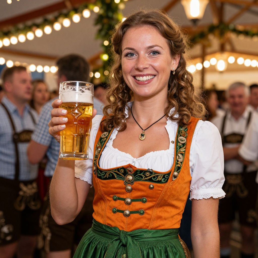 Woman smiling brightly while holding a glass of amber beer, dressed in traditional Bavarian attire including a white blouse, orange corset with gold buttons, and green skirt, surrounded by festive lights and people at an Oktoberfest celebration.