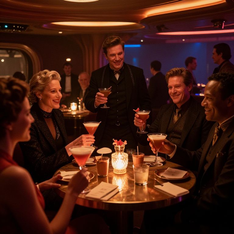 A group of well-dressed individuals enjoying a sophisticated cocktail party aboard the Battlestar Galactica. The scene features an admiral and officers celebrating a victory against the Cylons, with a warm and cinematic ambiance. The attendees are raising their glasses in a toast around a table adorned with a candle centerpiece and various cocktails.