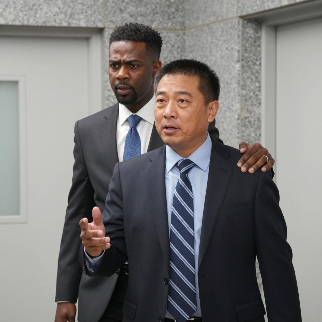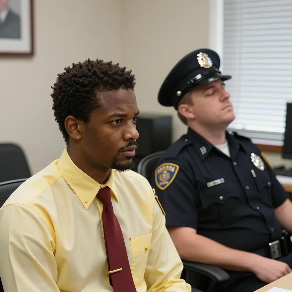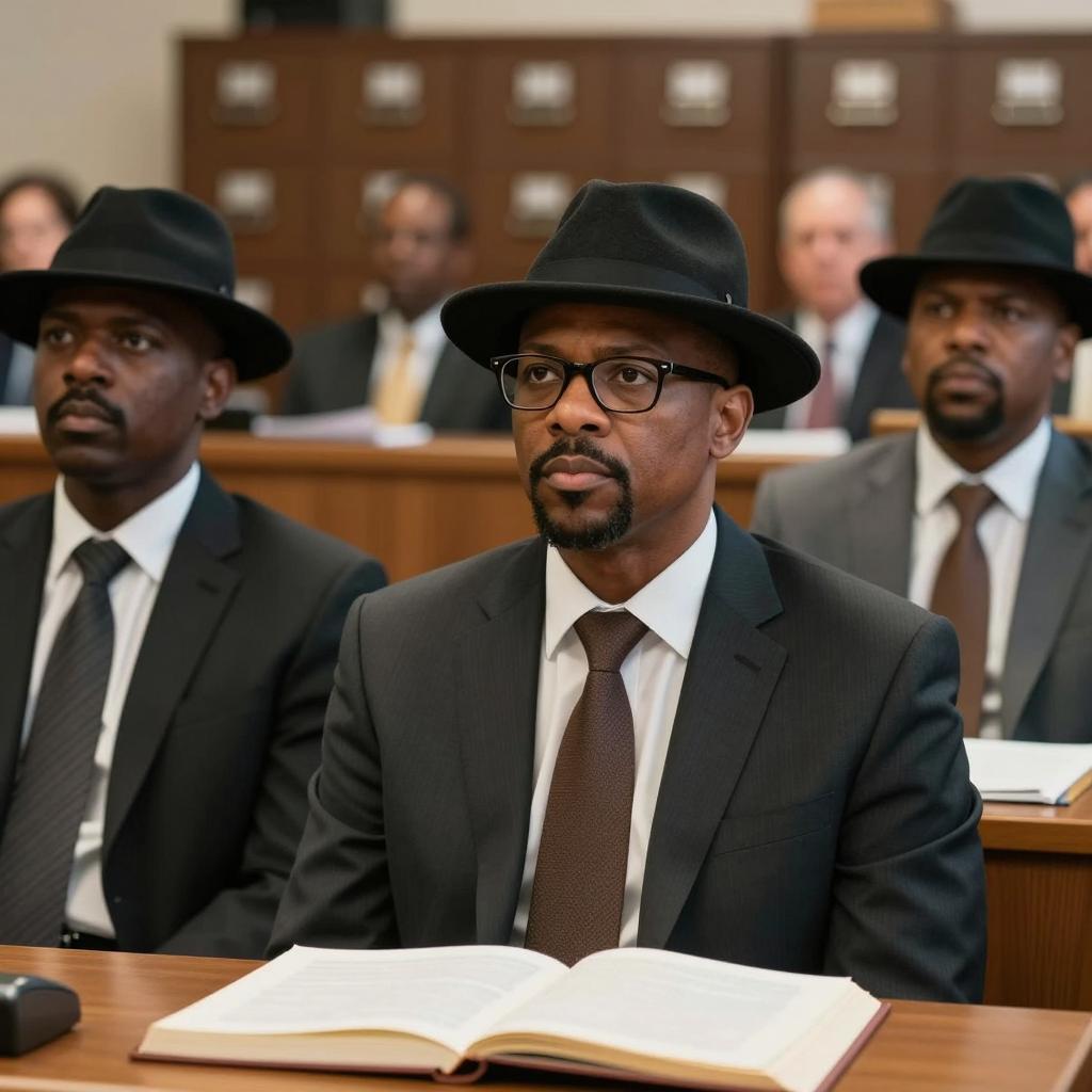Photograph of a courtroom. Black man in gray suit stands speaking, gesturing with right hand. Seated audience, mixed genders, formal attire. Four men in suits stand behind him, against chalkboard-covered wall. Wooden paneling, stairs in background. Intense expressions on audience faces.