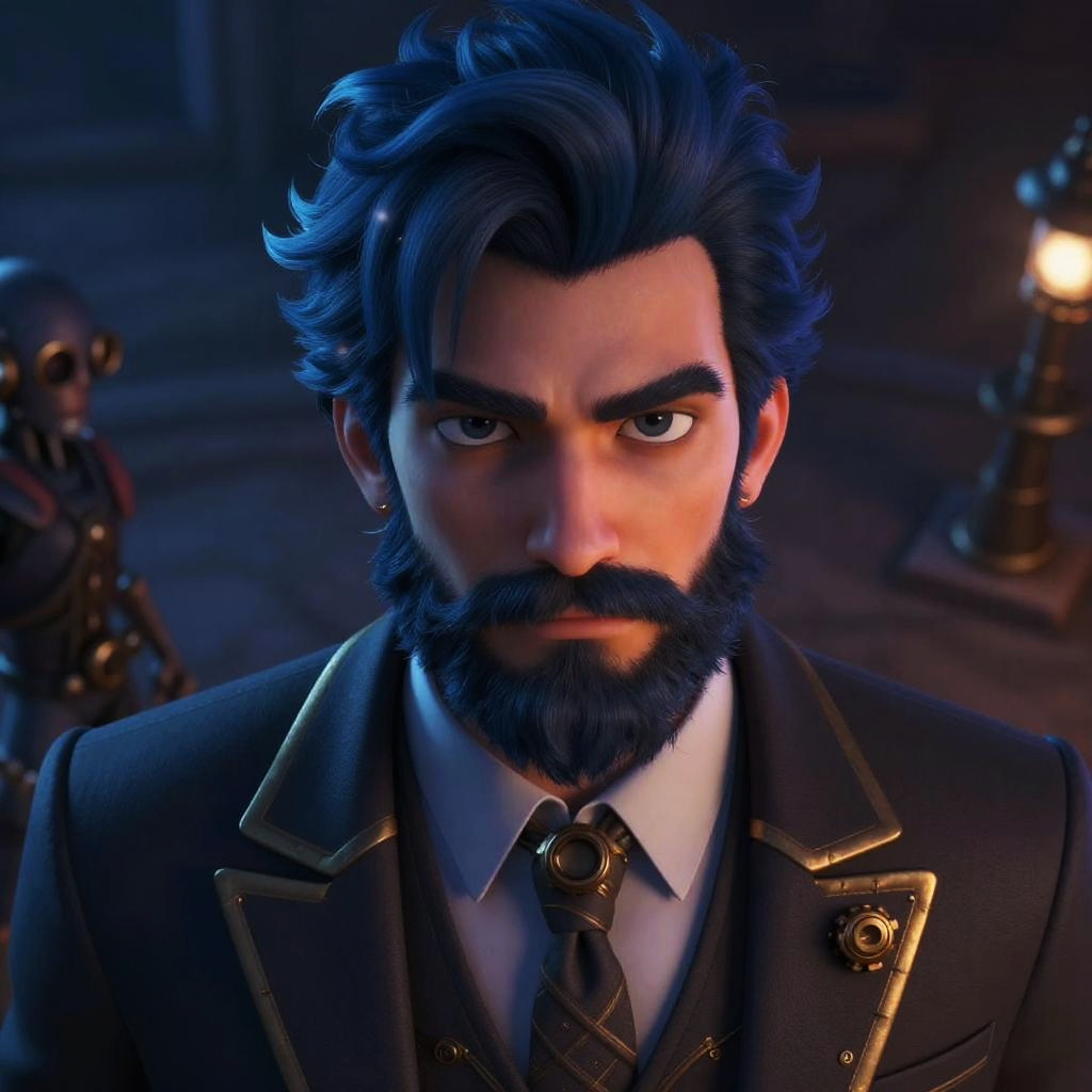 Highres, masterpiece, perfect lighting, night, bloom, cinematic lighting, adult, male, 1boy, looking at viewer, portrait, close up, from above, facial hair, wild beard, dark blue hair, formal, suit, dark theme, (steampunk:1.3), cartoon stylish, (expressive), (cybernetic:1.18), toned, serious