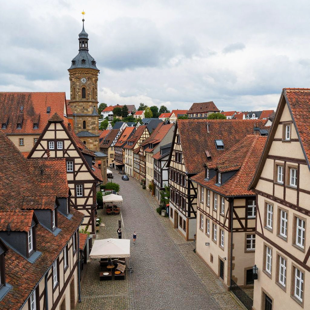An historic European town, viewed from above. cobblestone streets, half-timbered houses.