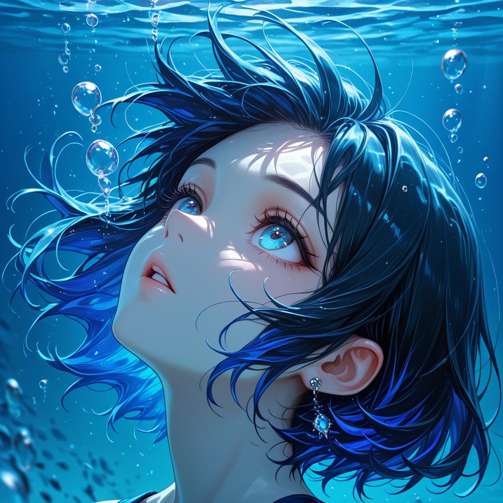 Digital art portrait of a single girl underwater with short black and blue hair floating around her. She has striking large blue eyes, parted lips, and wears a blue gemstone earring. The image captures air bubbles rising and light patterns on her face and water surface, emphasizing a serene and dreamy underwater scene with a blue color theme.