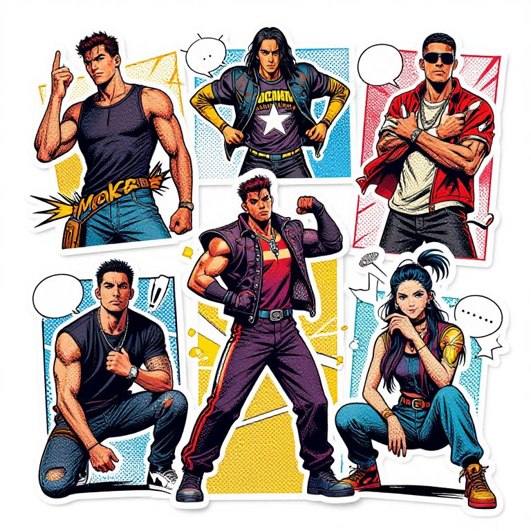Custom stickers featuring comic book style graphics, dynamic poses of characters without trademarks, vibrant color palette, halftone shading, energetic layout with speech bubble elements, designed for use in youth culture and streetwear aesthetics.