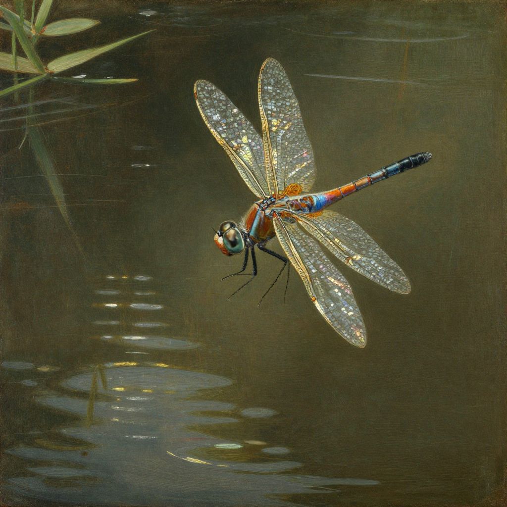 A mesmerizing oil painting captures an enchanting dragonfly mid-flight over a tranquil pond, reminiscent of Albrecht Dürer's ethereal style. From above, we witness its delicate wings reflecting sunlight and casting vivid prismatic hues onto the shimmering water below. This scene evokes a sense of serene beauty intertwined with a wistful longing as the dragonfly searches for something beyond our sight, highlighting the profound connection between nature's fragile elegance and the mysteries that forever elude us.