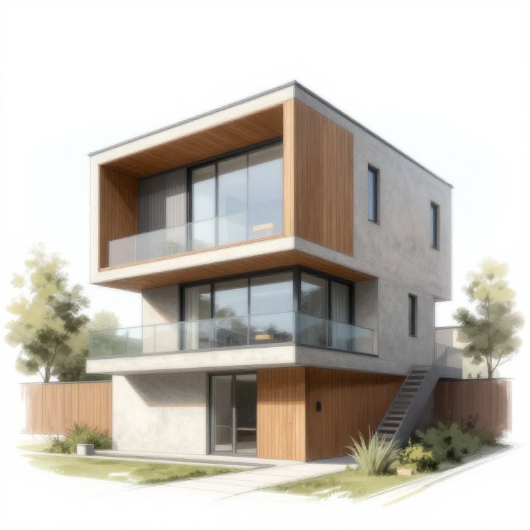 Easy modern house drawing in a digital art style, focusing on a compact and stylish urban house with a combination of wood, concrete, and glass materials, bright and clear lines with subtle shadows, highlighting the harmony of modern design and nature.