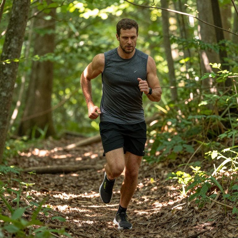 Photograph of a muscular, bearded man in a dark gray sleeveless shirt and black shorts, running through a sunlit, green forest path with