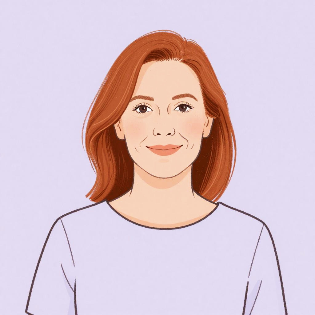Digital illustration of a smiling woman with red shoulder-length hair, wearing a white shirt, against a plain white background.