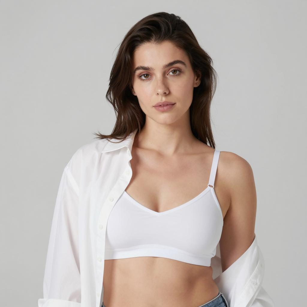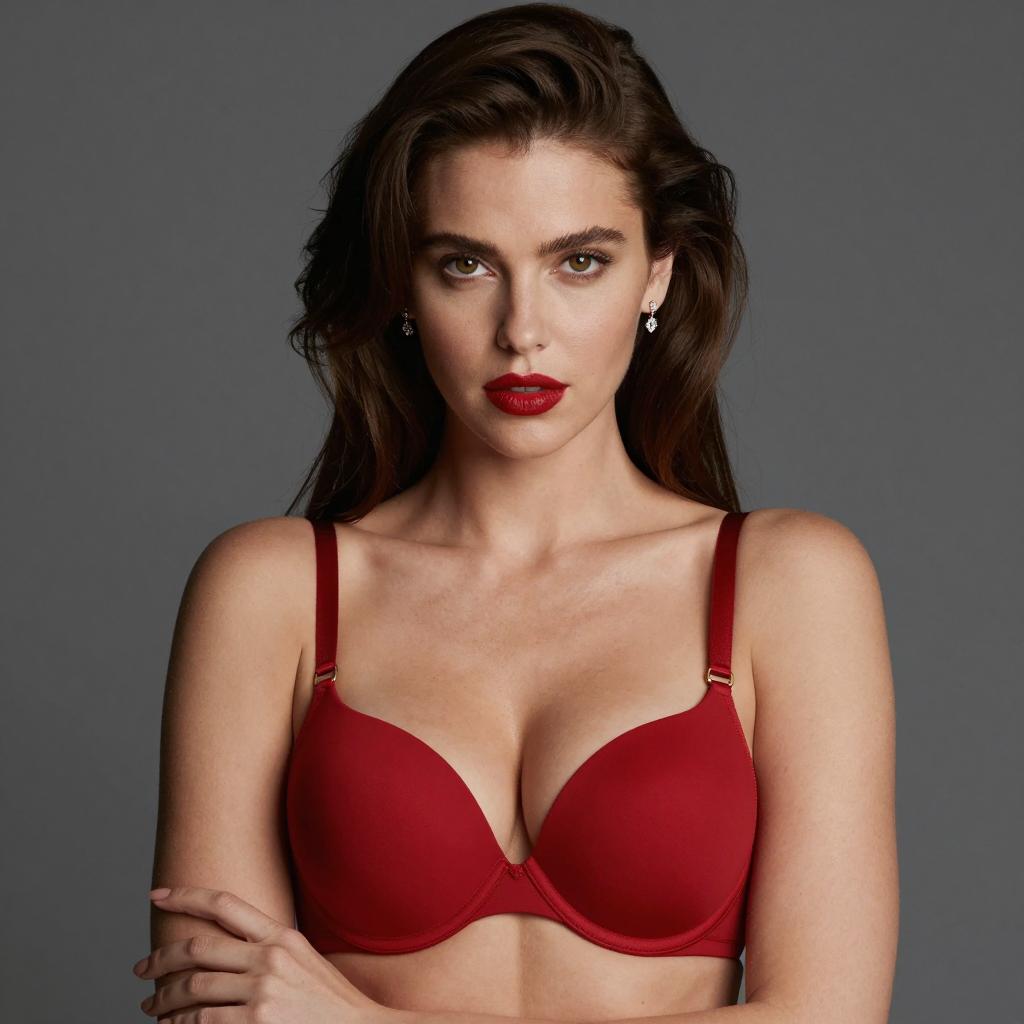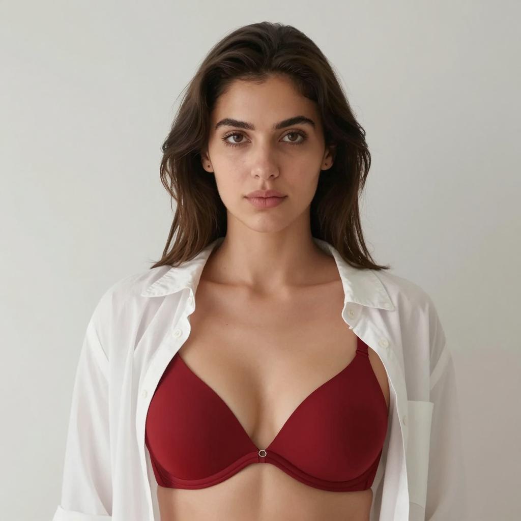Photograph of a woman with long, dark brown hair, fair skin, and brown eyes. She wears a white, unbuttoned shirt over a red bra with a small silver center ring. Her bra covers her medium-sized breasts. She has a neutral expression. The background is a plain, light-colored wall.