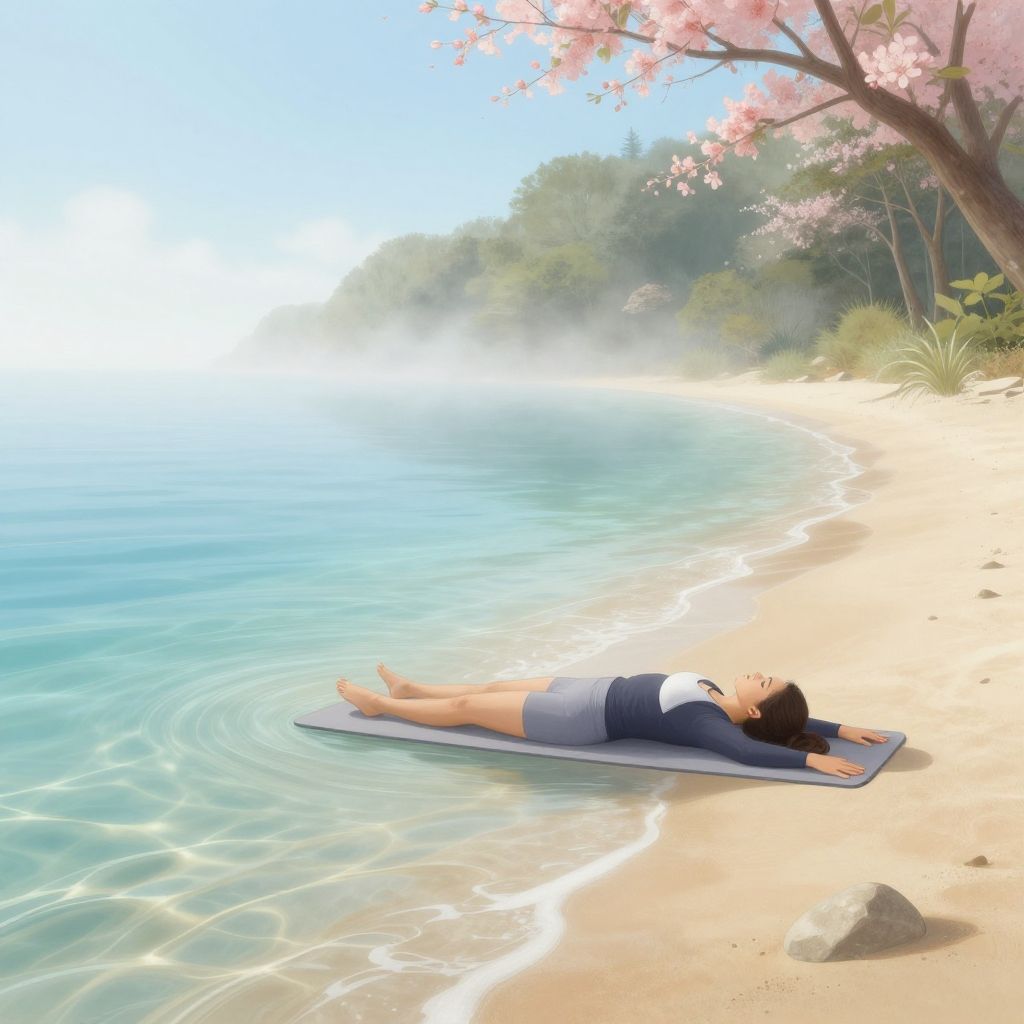Small boobs beach morning, calm crystal-clear water, a woman practicing yoga on the shore, soft mist, blooming flowers nearby, peaceful mood, high-detail digital painting