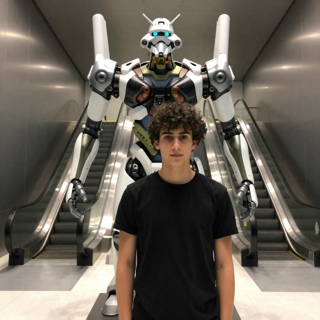 Young man with curly dark hair, wearing a black t-shirt, stands in a modern, metallic-walled room. Behind him, large, detailed black and white mechanical sculpture of a humanoid figure with an open mouth. Overhead lights reflect off the sculpture. Multiple silver escalators in the background. Man's expression is neutral. Room has a high, ured ceiling.