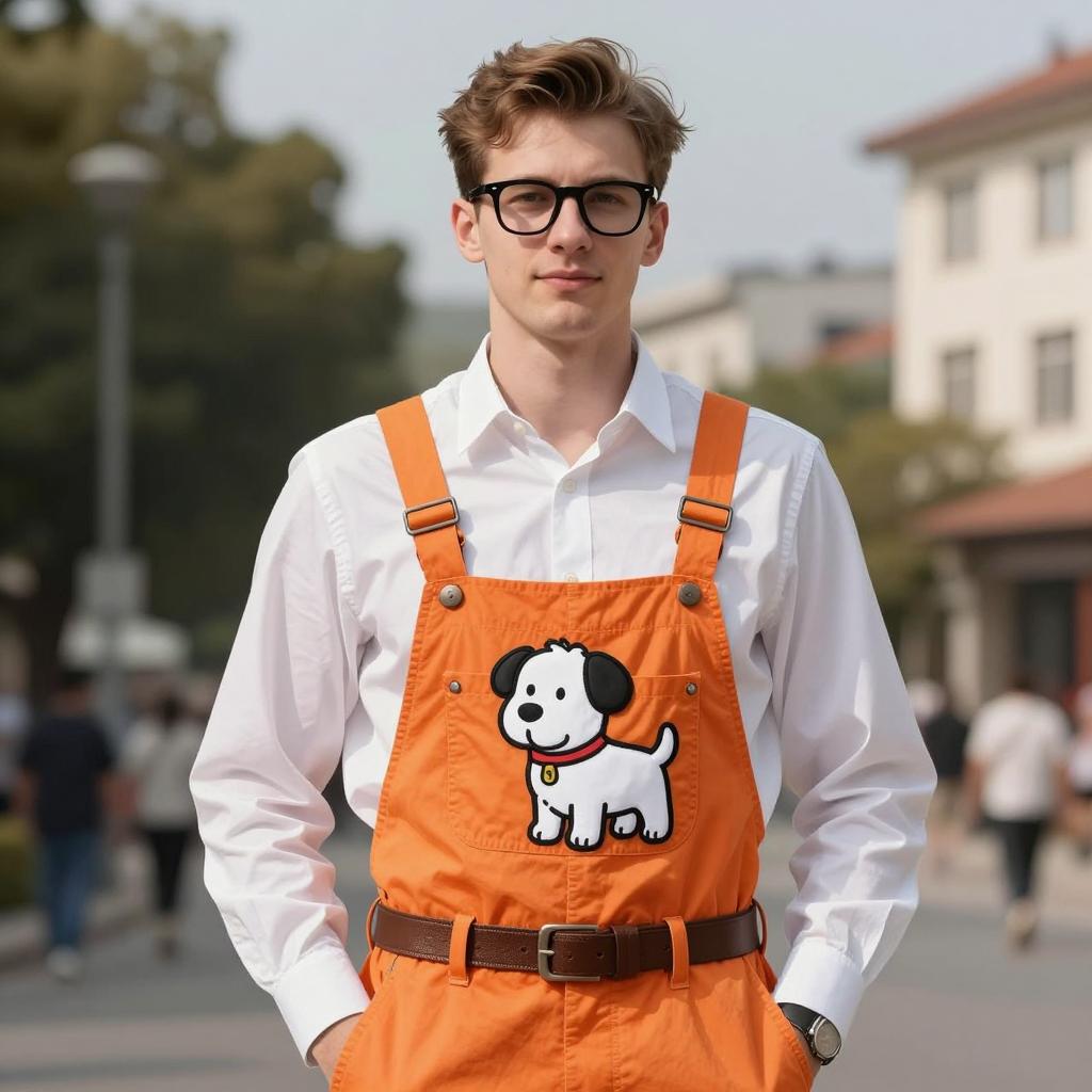 Photorealistic portrait of a young man wearing bright orange overalls featuring a white cartoon dog on the chest, paired with a white dress shirt and brown belt. He has short brown hair, black-framed glasses, and stands outdoors in daylight with hands in pockets. The background includes blurred trees and buildings, highlighting a casual modern style.