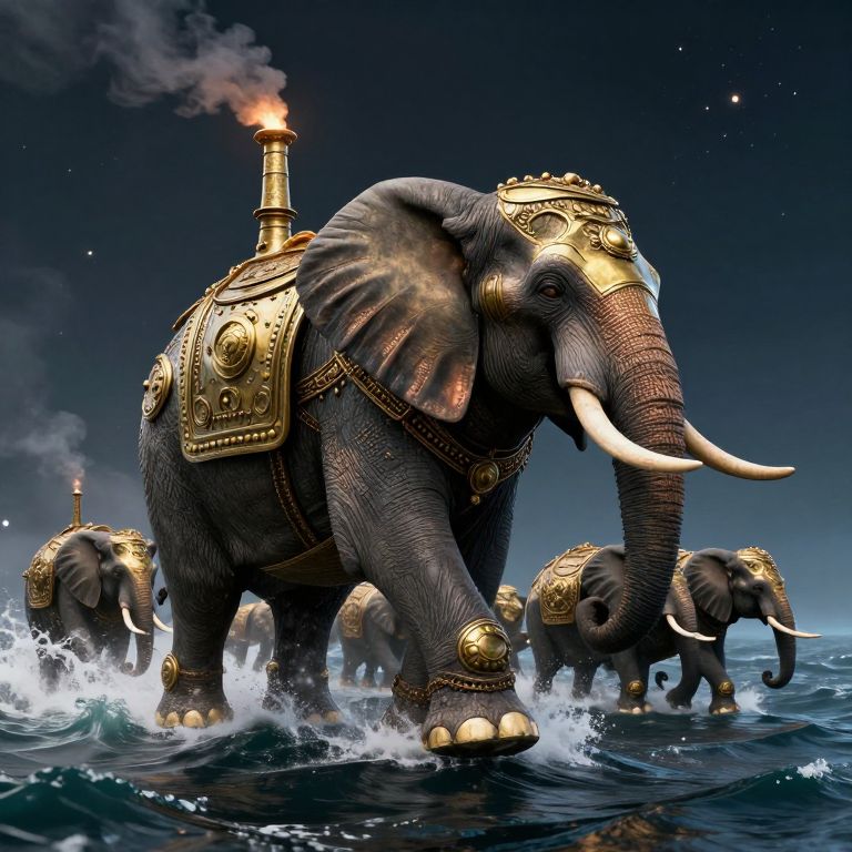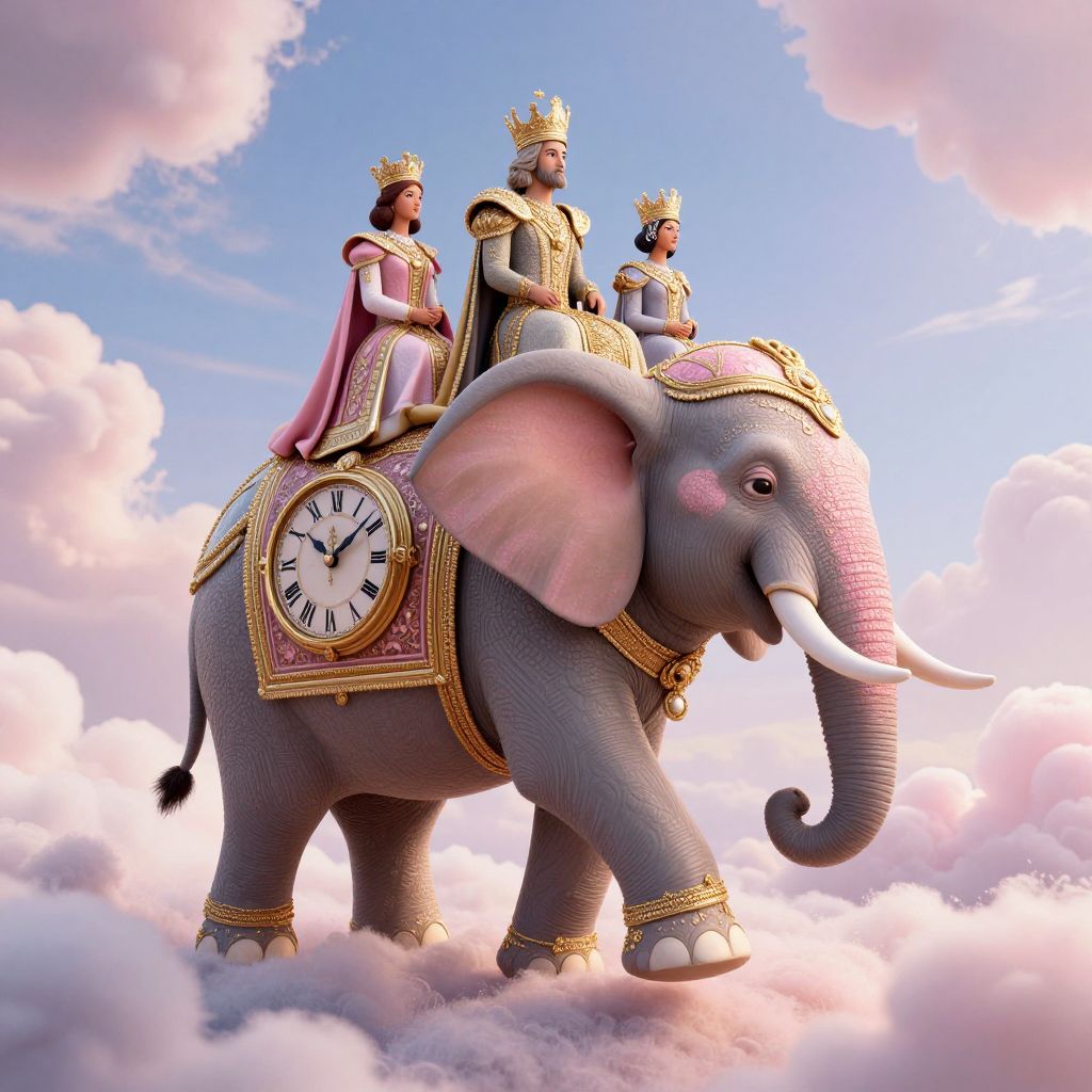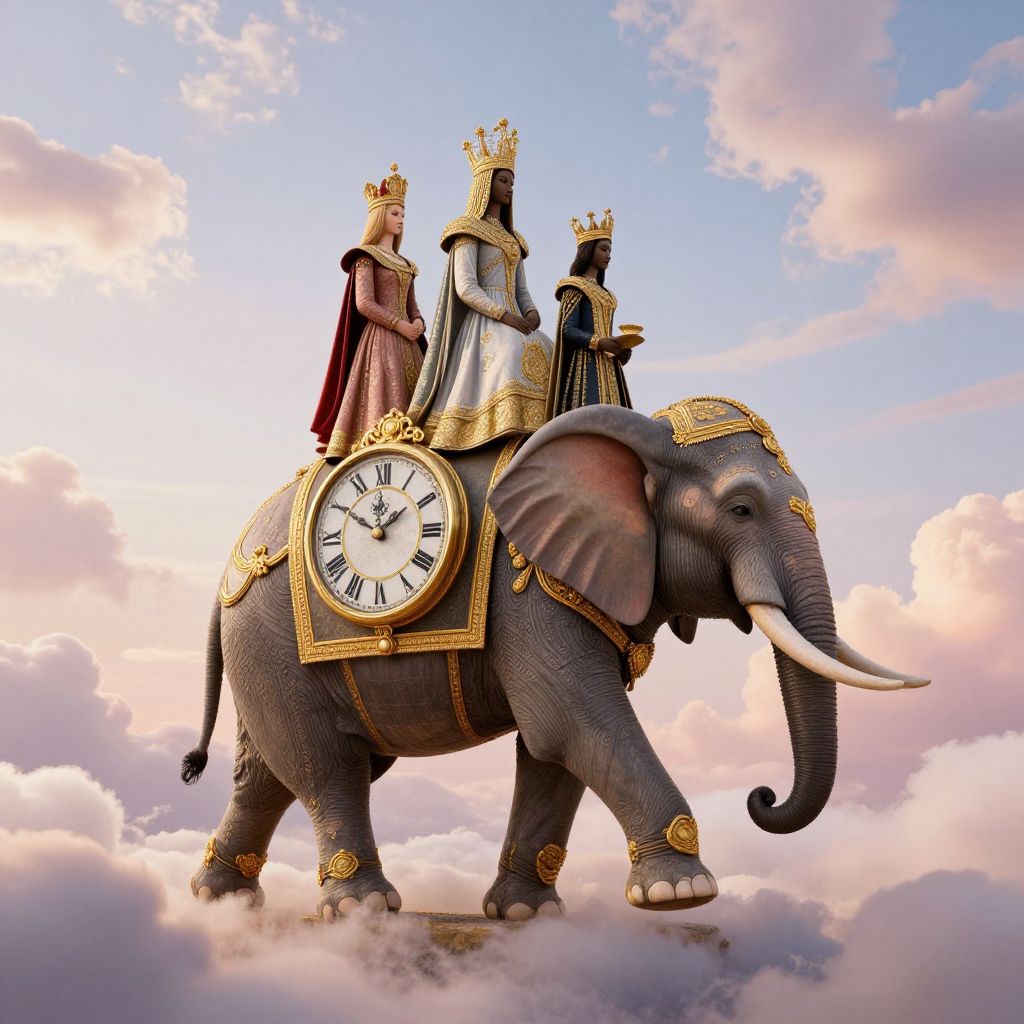 Digital artwork of a regal elephant with a clock on its side, adorned with gold, carrying four crowned figures above fluffy clouds.