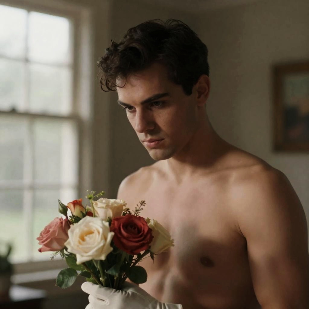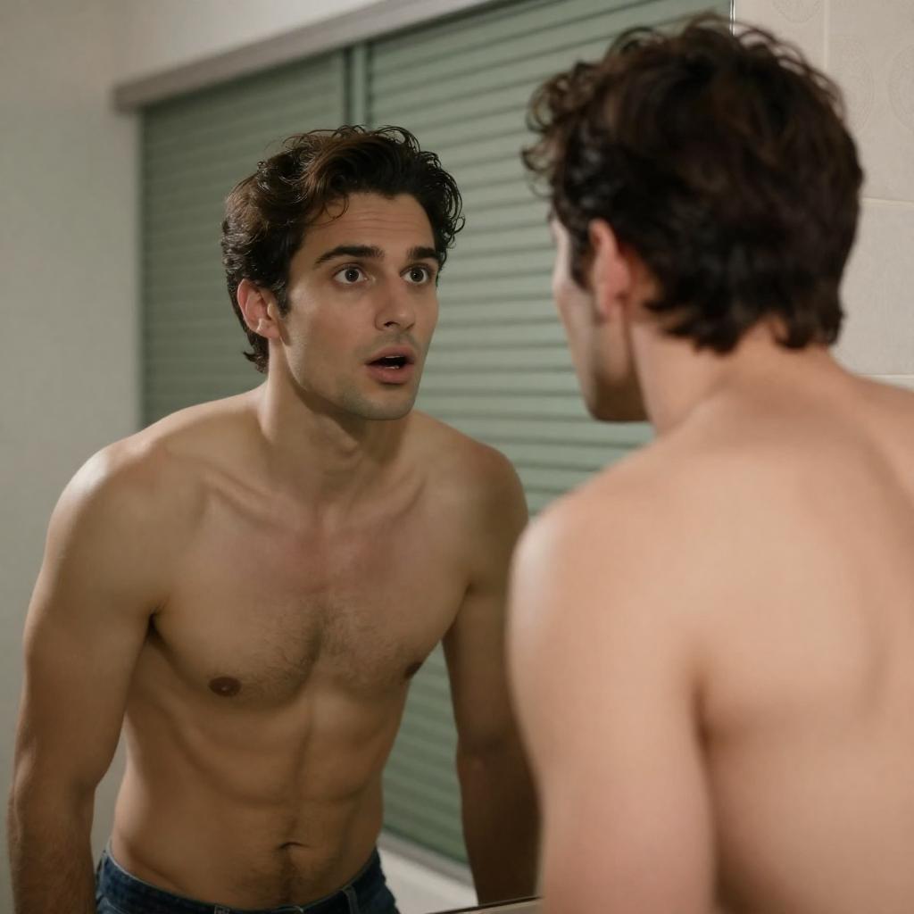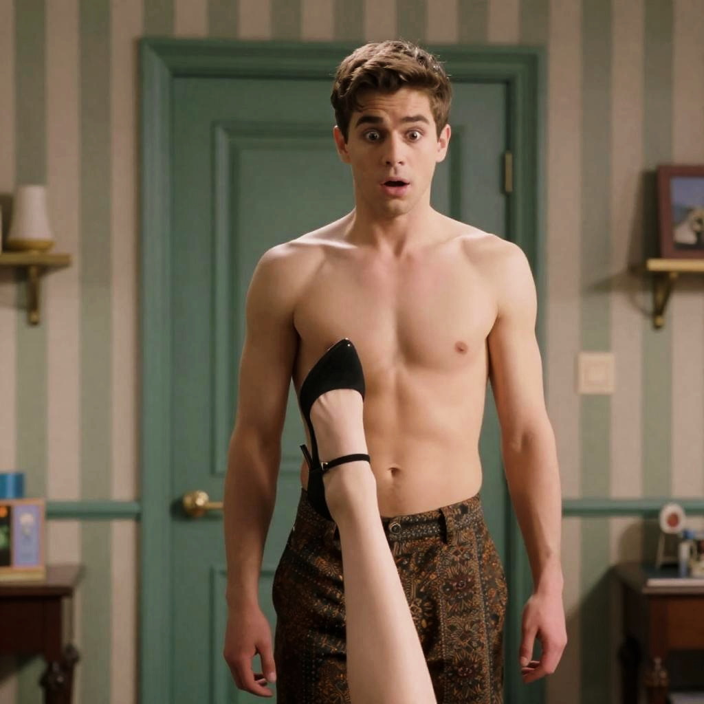 Shirtless young man with short brown hair, surprised expression, standing in striped room, wearing patterned pants, green door behind. Woman's leg, black high heel, in foreground, foot near man's face. Green door, striped wallpaper, shelf with items.
