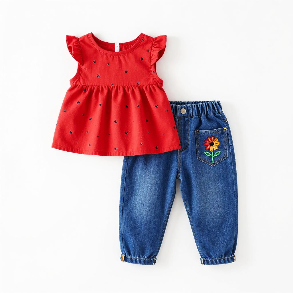 A photograph of a cute, pink children's outfit. The top is a long-sleeved, round-neck shirt with buttons down the front and a slightly flared hem. It's paired with matching pink pants adorned with white and orange floral patterns. Both pieces have a soft, lightweight fabric with a gentle, pastel color palette. The shirt and pants are neatly laid out against a plain white background.