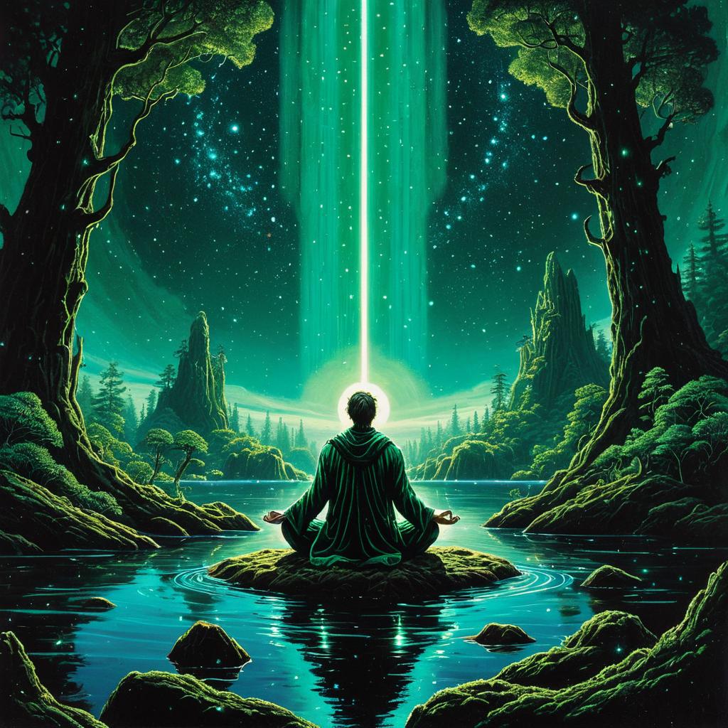 A mystical depiction of an interstellar druid meditating in a serene space environment. The scene features floating emerald isles framed by bioluminescent forest trees, glowing with vibrant green light under a starry sky. Streams of light descend from a bright celestial body, creating a surreal and tranquil atmosphere.