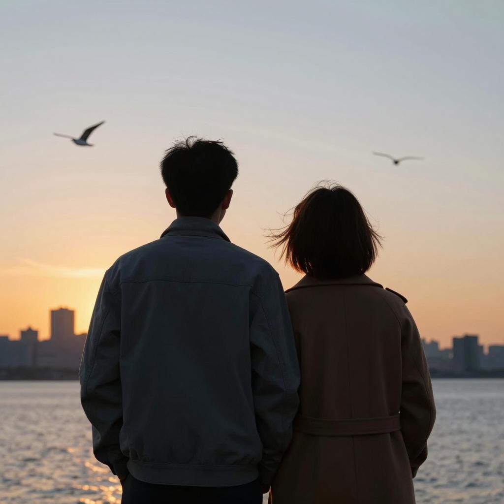 Dark photograph of a silhouette of a person with short, dark hair standing in a window frame, looking at a cityscape. City skyline with illuminated buildings and red lights reflecting on the water. Bare tree branches visible outside the window.
