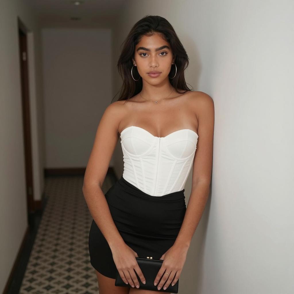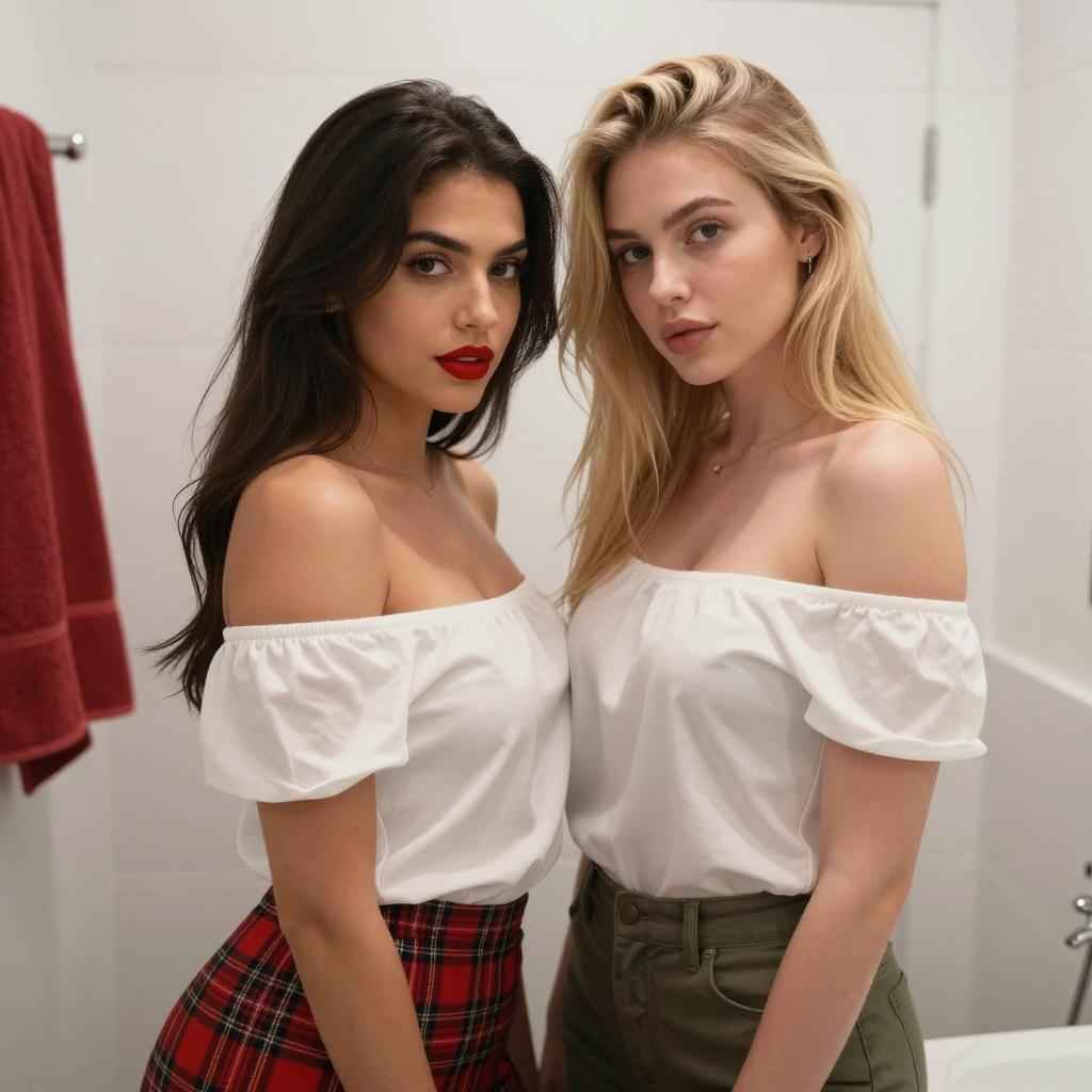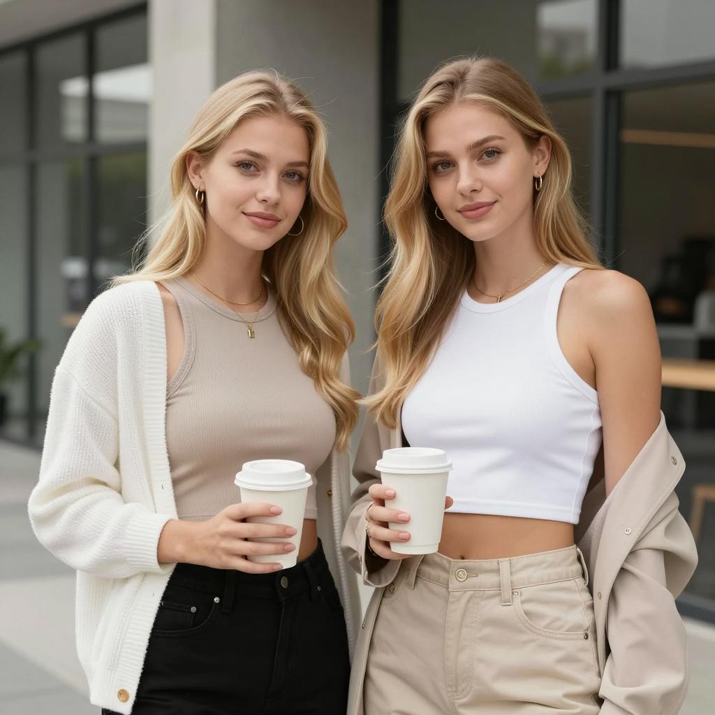 Two young women standing closely in a narrow urban alley. Both wear brown, low-cut, halter dresses with cutouts. The woman on the left has long brown hair, light skin, and a slight smile. The woman on the right has shorter brown hair, light skin, and sticks out her tongue. Brick buildings surround them. They lean forward slightly, arms at their sides. Both have small to medium-sized breasts. The woman on the right wears a pearl necklace.