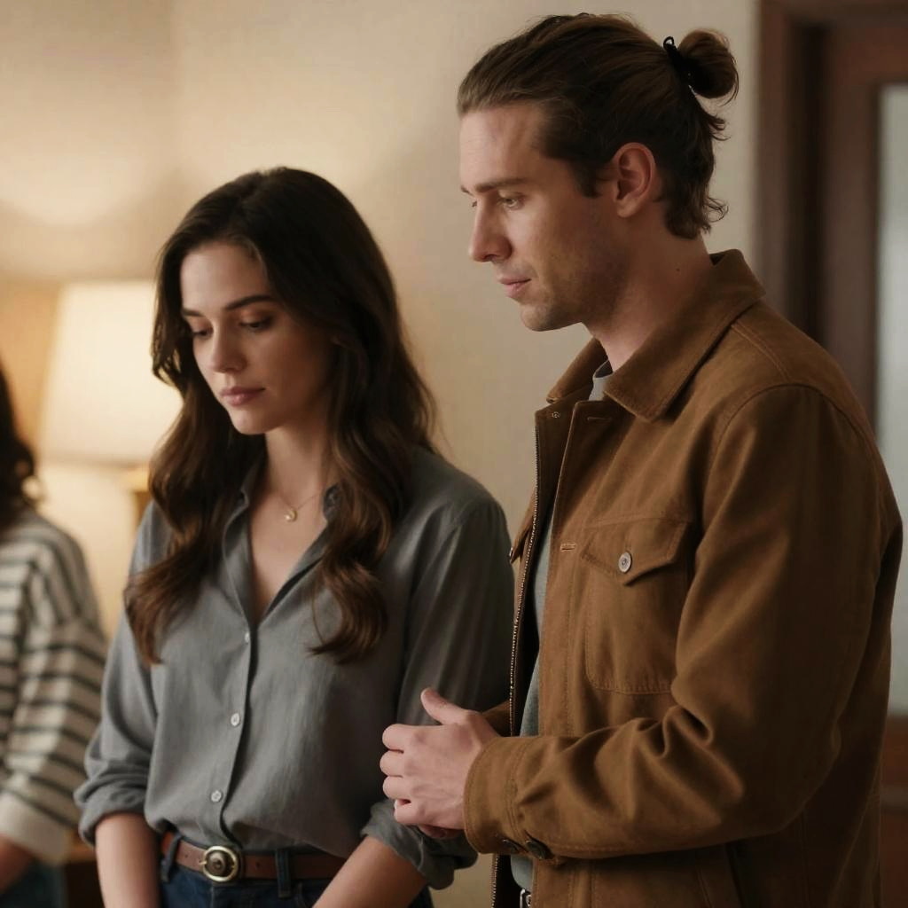 Photograph of three people standing outdoors. Foreground: blue car roof. Middle: woman with long brown hair, denim jacket, white top, black pants, standing close to a man with short blond hair, blue shirt, black pants. Background: man with dark hair, green shirt, blue jeans. House with brown door, wooden steps, green plants. Woman and blond man hold hands. All three have neutral expressions.