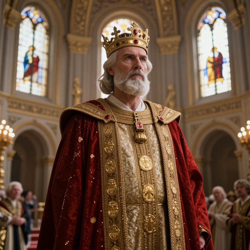 Photograph of an elderly, white-bearded king in a golden crown and ornate red and gold robe, standing in a grand, illuminated cathedral.