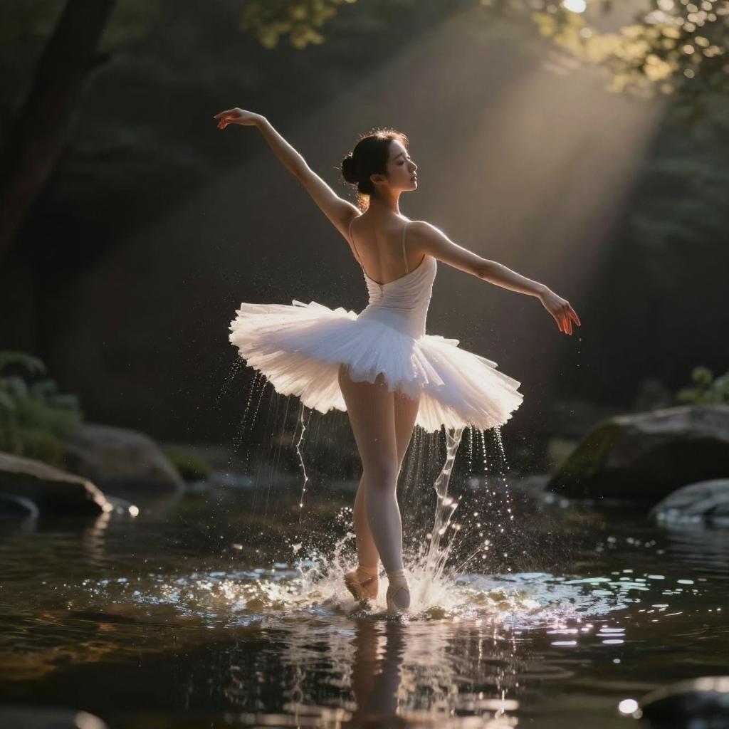 Photograph of a ballerina in a white tutu, poised gracefully in a sunlit forest stream, splashing water with delicate movements.