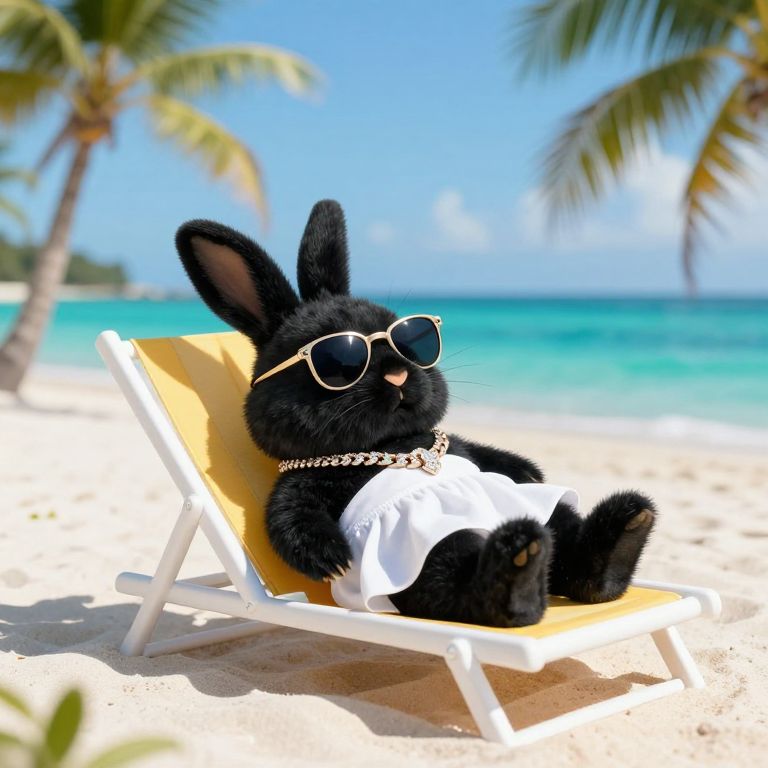 A super cute black rabbit is lounging on a sunbed on a white sandy beach, surrounded by crystal clear turquoise waters and palm trees. The rabbit is wearing a white summer dress and sunglasses, with a big and shiny diamond gold chain necklace on its neck. The rabbit is relaxed and smiling, enjoying its vacation. The beach scene is vibrant and inviting, with the sunbed positioned in the foreground, the rabbit comfortably seated, and the palm trees swaying gently in the background. The overall composition is balanced, with the rabbit as the central focus, and the beach elements creating a serene and idyllic atmosphere.