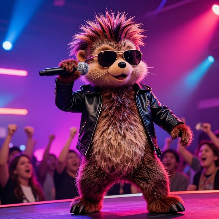 Photograph of a cartoonish, anthropomorphic hedgehog with brown and black fur, wearing black sunglasses and a black leather jacket, holding a microphone. The hedgehog stands confidently on a stage with a cheering crowd in the background. The stage is illuminated with vibrant purple and blue lights. The crowd, composed of diverse individuals, raises their hands in excitement. The hedgehog's spiky hair and expressive face add a playful, energetic vibe to the scene. The image captures a lively, musical performance atmosphere.
