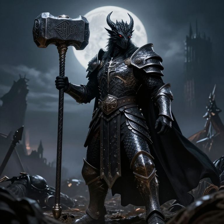 Majestic black dragonborn paladin with metallic scales shimmering under moonlight, carrying a massive warhammer etched with ancient symbols, cloaked in a flowing cape, standing amidst a battlefield strewn with fallen foes, dramatic and heroic composition.