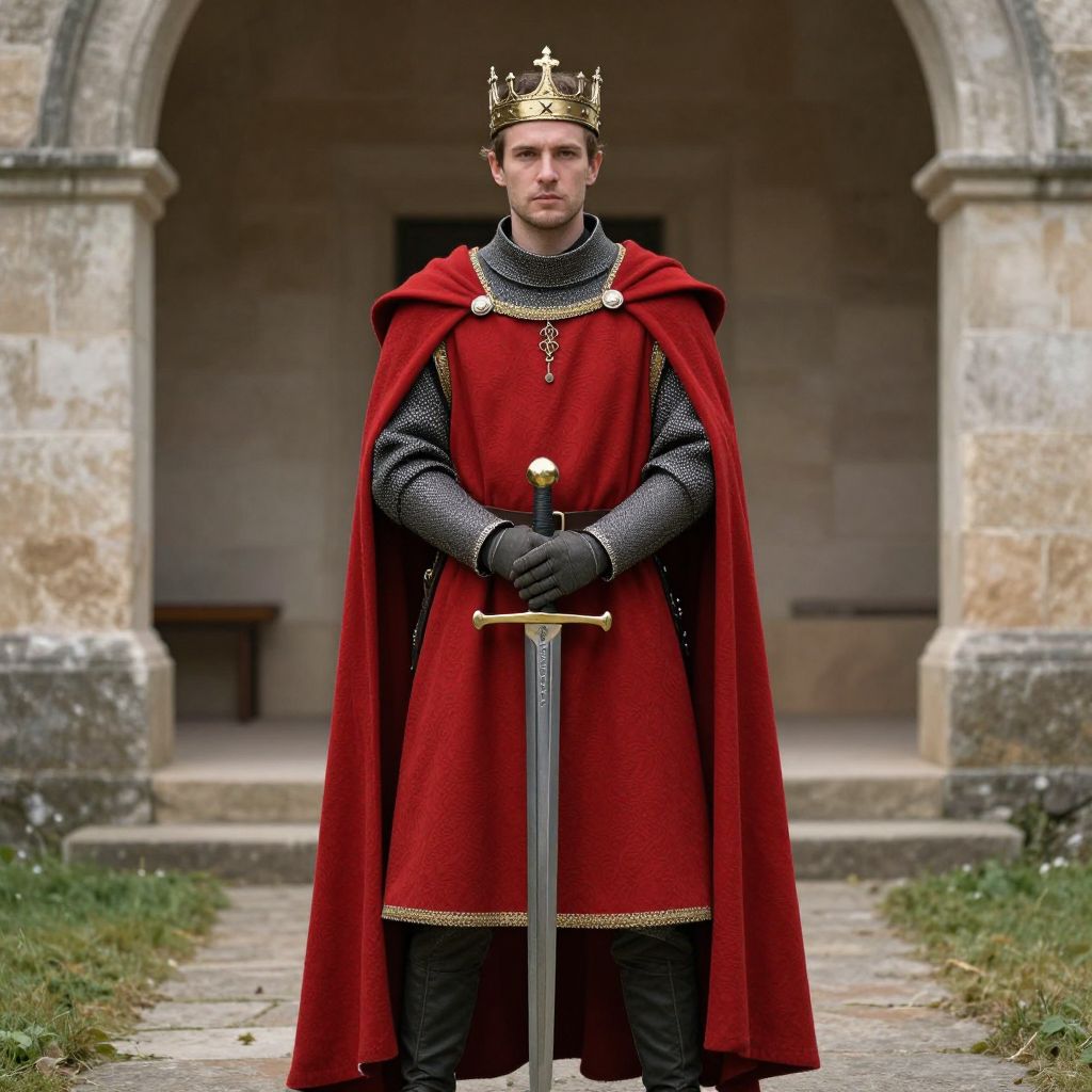 Photograph of a young, serious-looking man in medieval armor, wearing a red cape and golden crown, standing in front of a stone archway,