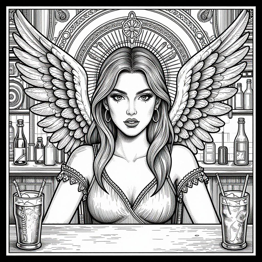 A detailed line drawing of a woman with wings in a pub, featuring intricate background details and a symmetrical face.