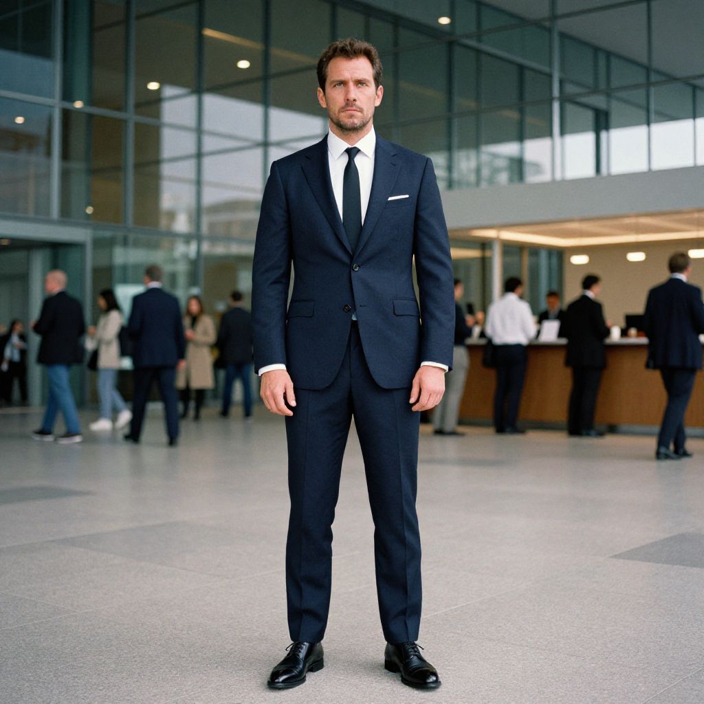 A man, navy wool suit, crisp white dress shirt, slim black tie, polished black leather oxford shoes, tailored fit, modern glass facade, bustling reception area, chromogenic film, confident expression. Man has masculine face and piercing eyes