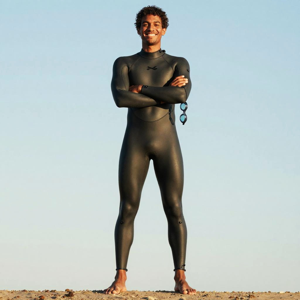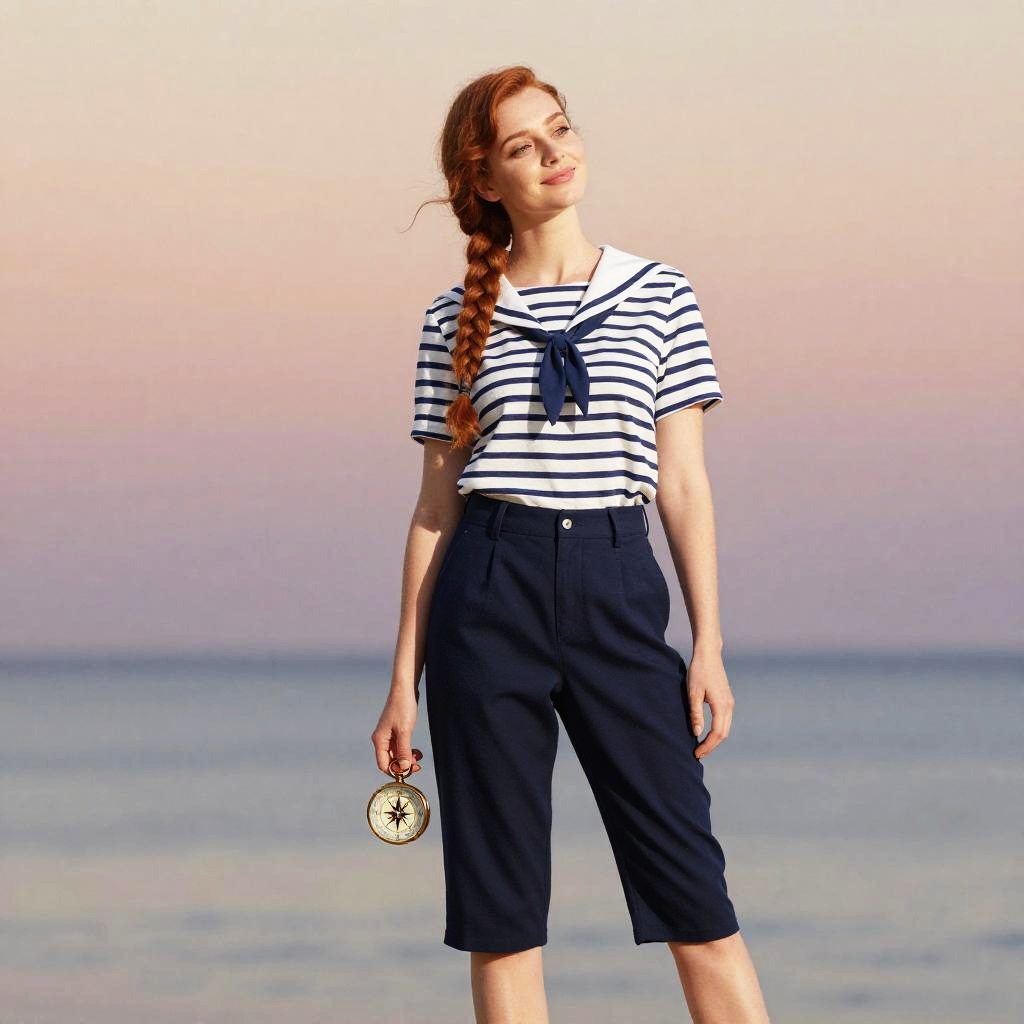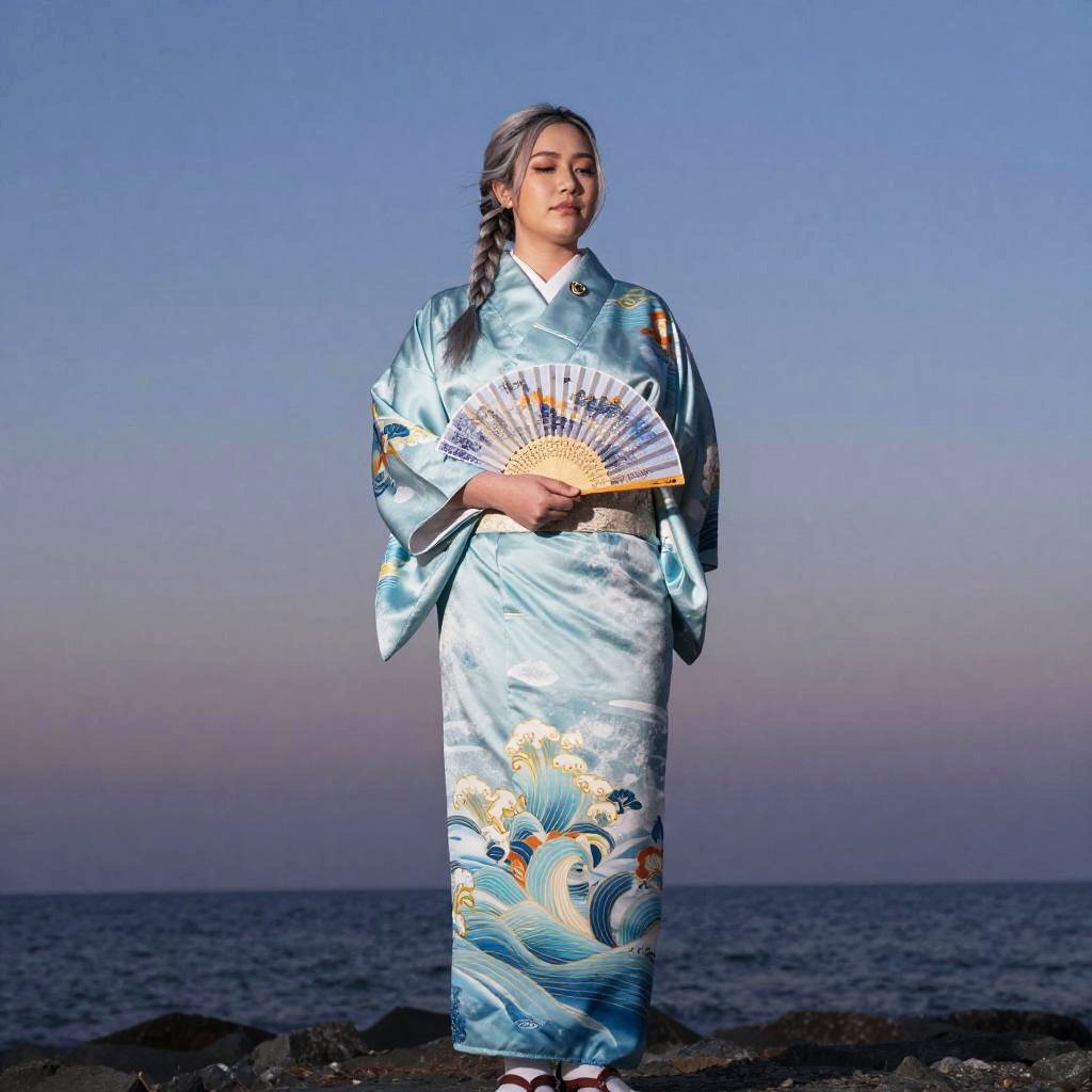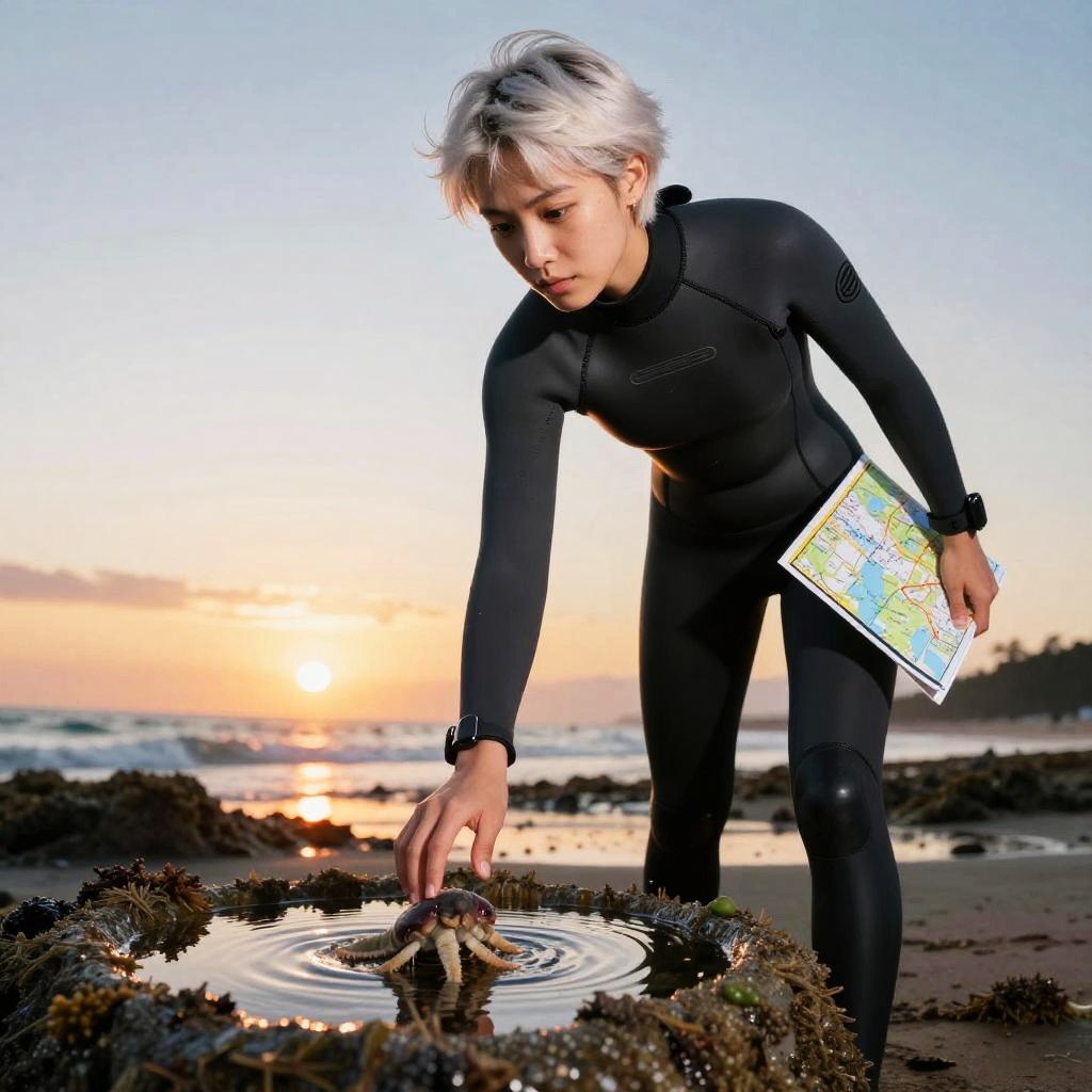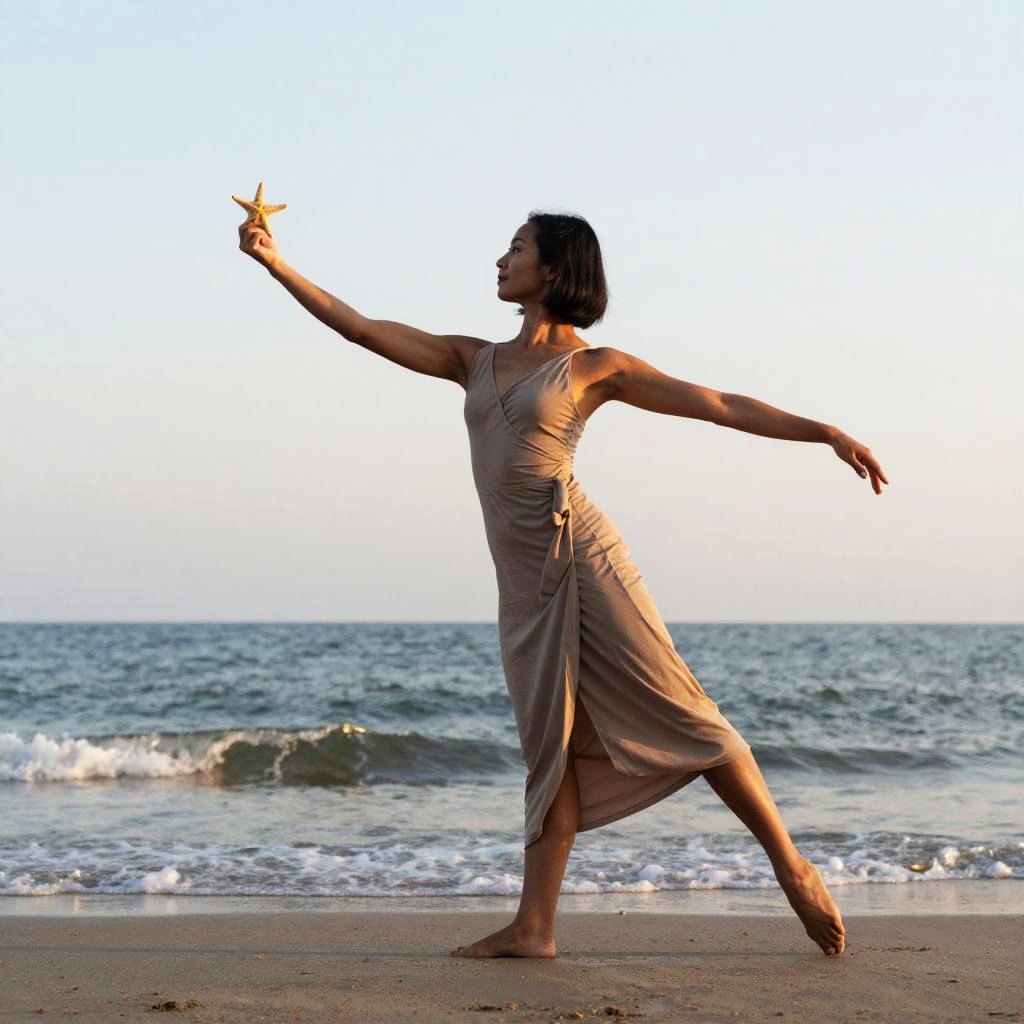 Wide shot, petite dancer with sleek dark bob and graceful posture, elegant wrap dress billowing in the sea breeze, standing on the shore, one leg extended mid-step, inviting movement, nestling a delicate starfish gently, gradient background