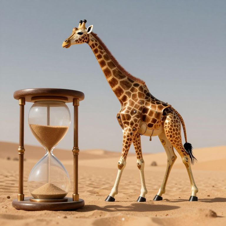 A clockwork giraffe with ticking brass hooves strolls through a desert of hourglasses, each grain of sand dropping in perfect synchronization with its every step.