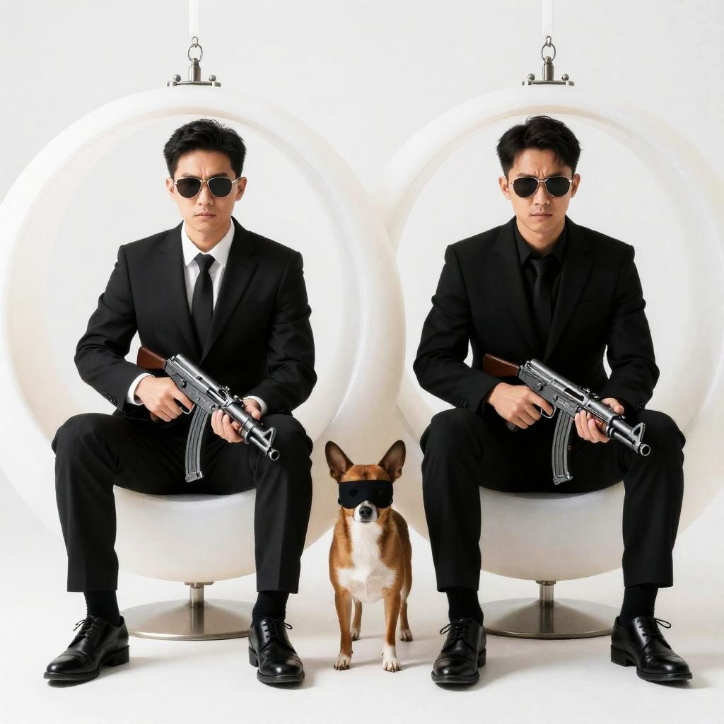 Three men in black suits and sunglasses, holding futuristic handguns. The left man points up, the middle man points forward, the right man has a bright flash from his gun. All serious expressions. Background white.