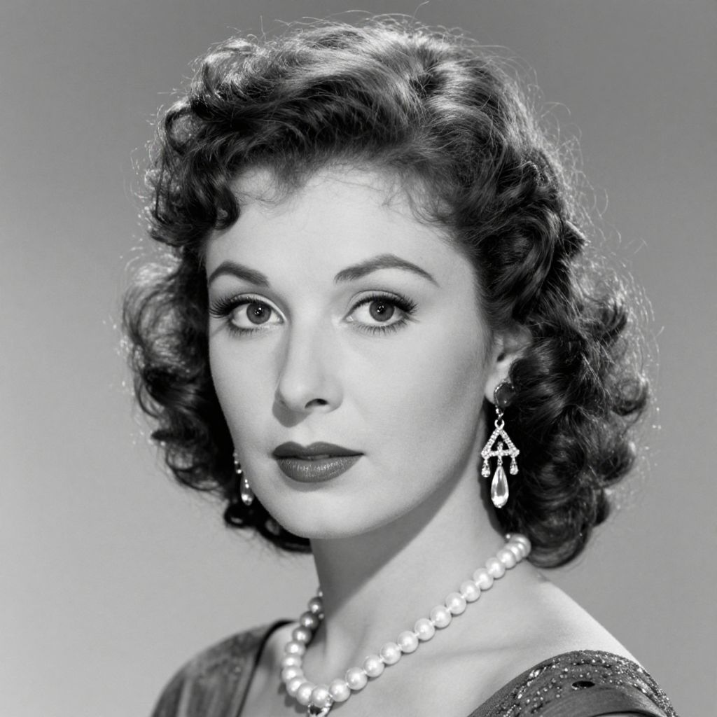 A high-definition black-and-white portrait captures a woman with voluminous, textured curls, adorned with elegant jewelry, including a pearl necklace and dangling earrings, exuding a timeless, classic aesthetic reminiscent of mid-20th-century photography.