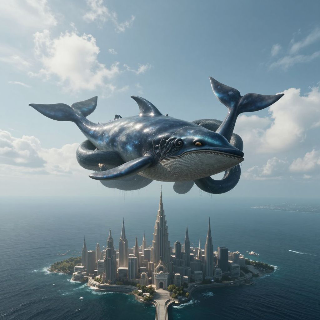 Photorealistic CGI image depicting a massive, metallic silver orca with detailed whale textures and realistic fins, hovering above a futuristic, futuristic city with numerous tall, pointed skyscrapers on a small island surrounded by a vast ocean. The orca's reflective surface catches the sunlight, highlighting its contours. The background features a clear blue sky with scattered white clouds. The city's architecture is sleek and modern, with a central, taller skyscraper prominently standing out. The overall scene combines elements of fantasy and realism, creating a surreal, imaginative atmosphere.
