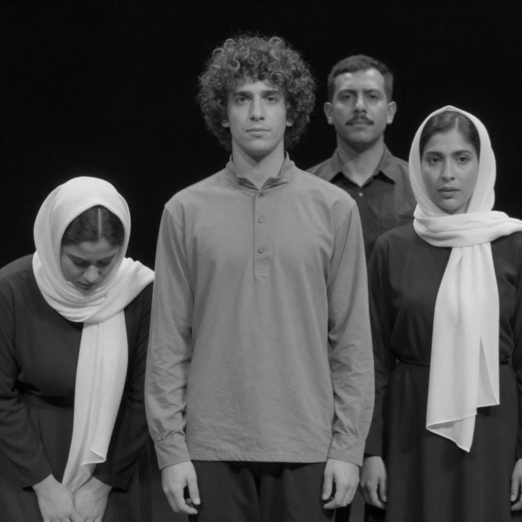 Black and white photograph of four people. A woman with a white headscarf bends forward, hands clasped. A man with curly hair and a high-collared shirt stands in the center. Another man with a mustache stands to the right. A woman with a white headscarf and dark dress stands to the far right. Dark background. The woman bending forward has a focused expression. The central man has a neutral expression. The standing men have neutral expressions.