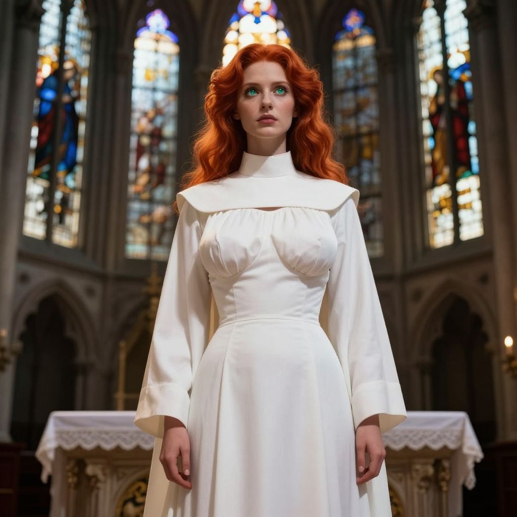 Photograph of a fair-skinned woman with long, wavy red hair standing in a dimly lit cathedral. She wears a high-neck, long-sleeved, white satin dress that fits her slender frame. Her expression is serious, with green eyes looking directly at the camera. The background features tall, arched stained glass windows with colorful patterns. In front of her, a white, ornately carved altar is partially visible. The image has a slightly surreal, digitally enhanced quality, emphasizing the vividness of her hair and the church's stained glass.