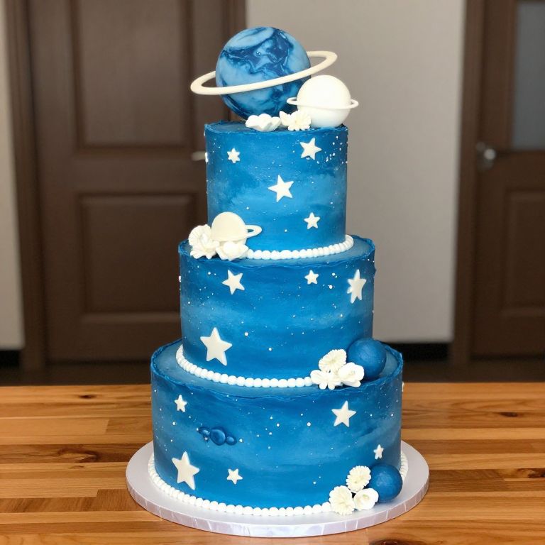 Tiered celestial-themed cake featuring three levels of vibrant blue frosting, adorned with white stars, planets, and floral accents, set atop a wooden table against a backdrop of closed doors.