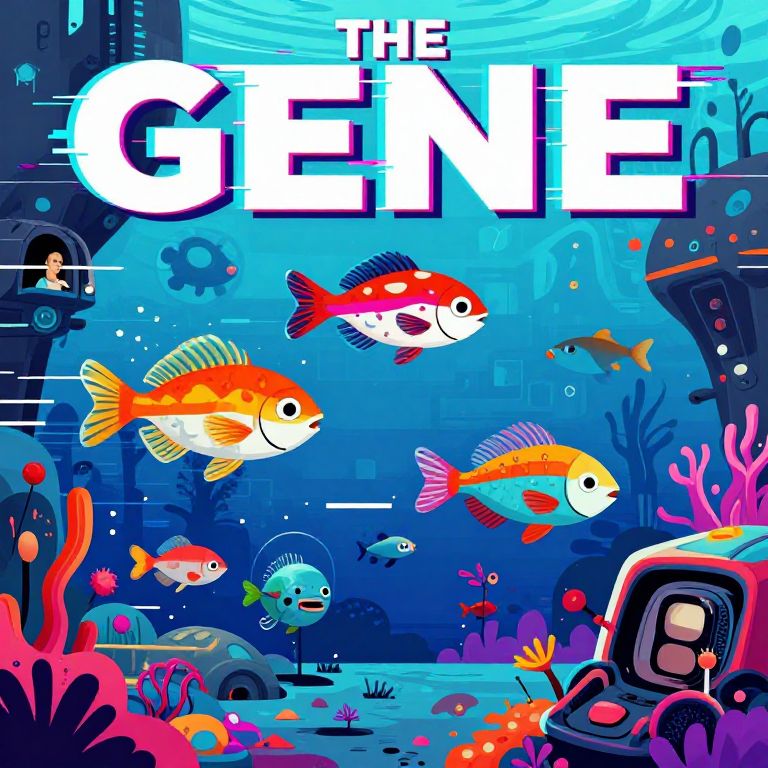 The Genie sci fi book cover showing robot fish underwater, collage art, glitch, bold colors, eye catching, a mix of modern illustrations and photographs,