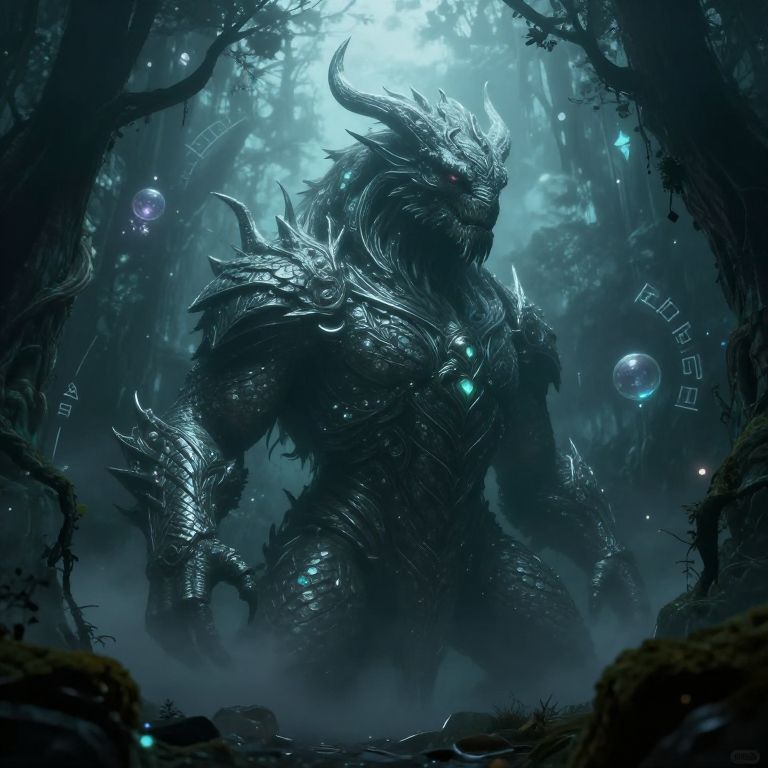 Digital fantasy artwork of a dark, glowing, horned, armored creature standing in a misty, blue-lit forest with ethereal orbs and runes